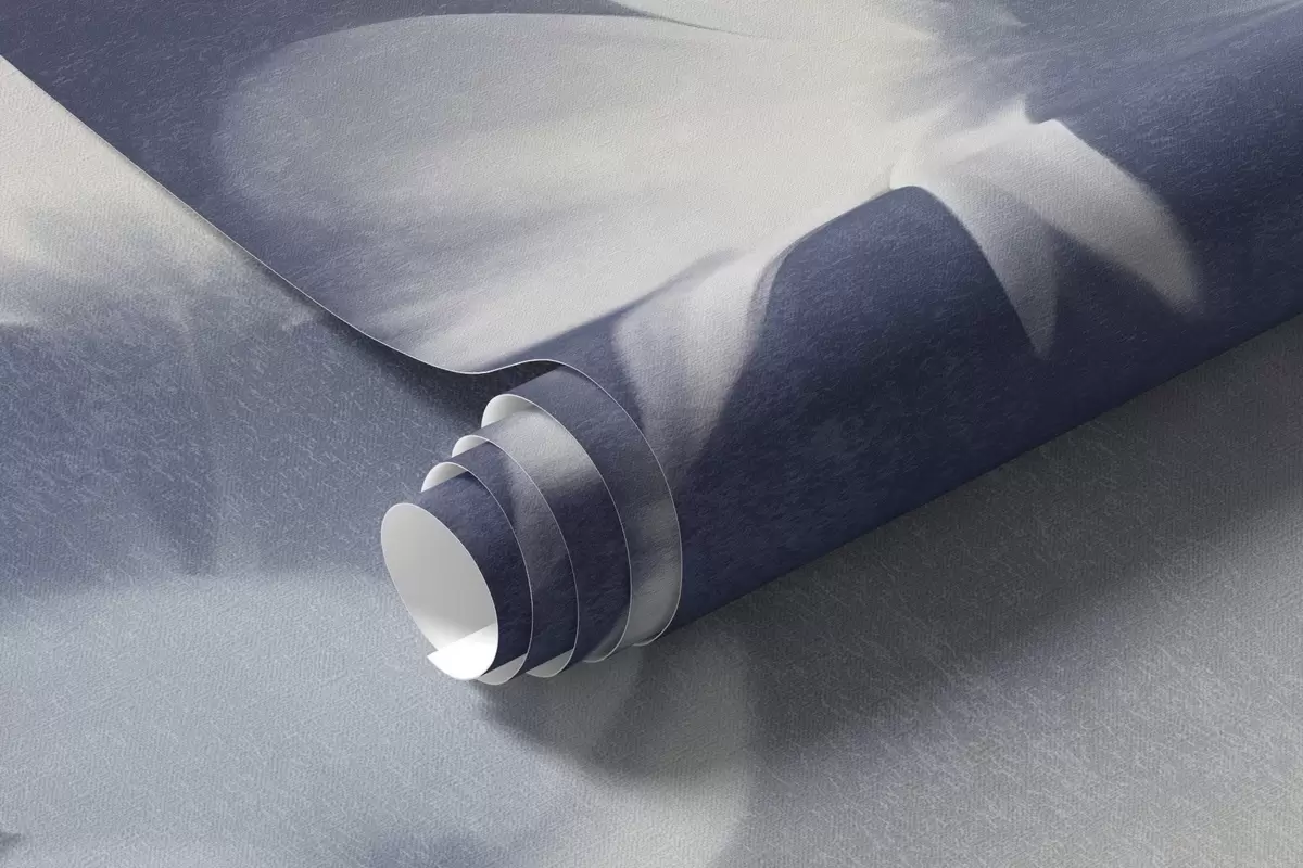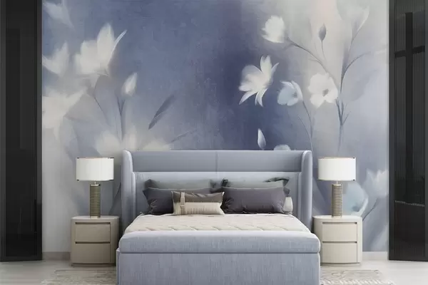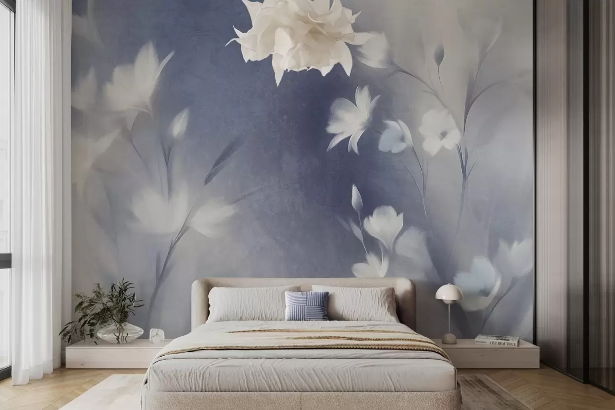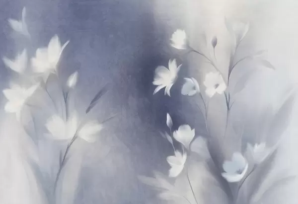 Фотошпалери Білі текстуровані квіти з довгими стеблами, м'які бутони на розмитому тлі блакитних і білих відтінків w09484