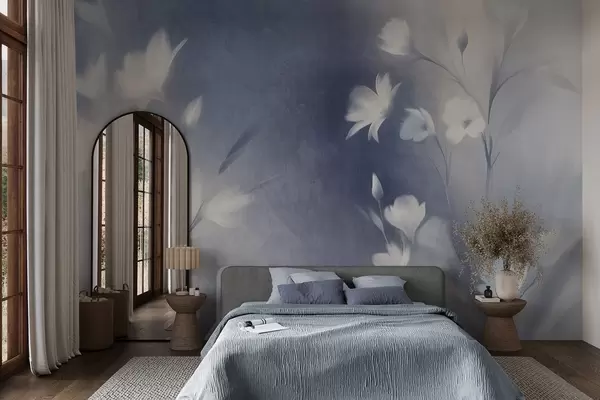 Фотошпалери Білі текстуровані квіти з довгими стеблами, м'які бутони на розмитому тлі блакитних і білих відтінків w09484