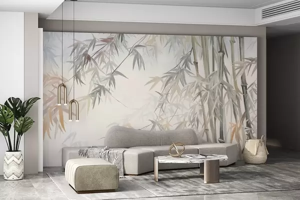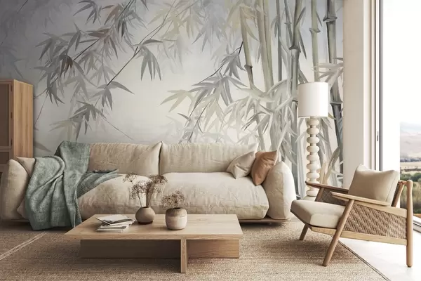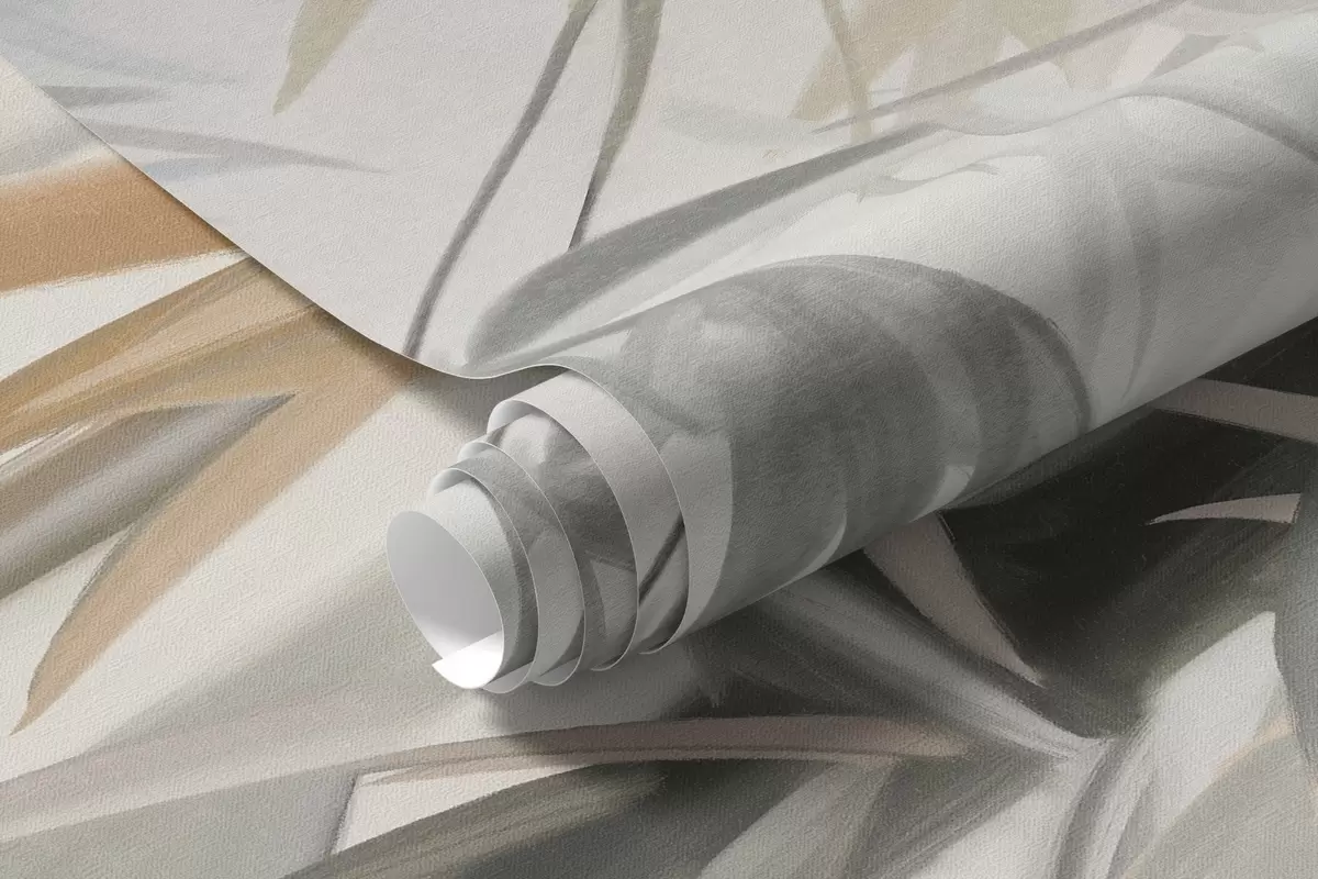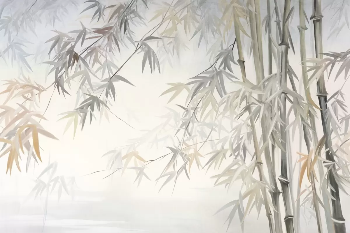 Фотошпалери Текстуровані бамбукові стебла та листя в м'якій, приглушеній кольоровій гамі сірого, білого та кремового кольорів, мінімалістична композиція w09485