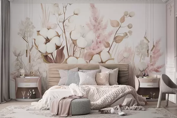 Фотошпалери Бавовняні квіти з білою та рожевою пампасовою травою, бежевими та коричневими листям і травами, білим фоном w09489