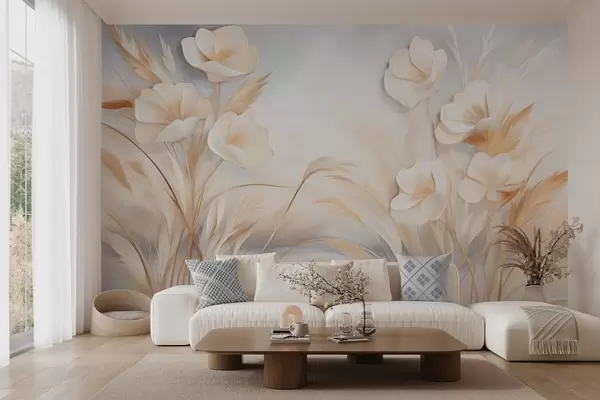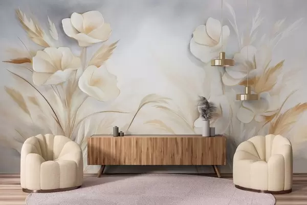 Фотошпалери Білі квіти, бежеві очерети та пампасова трава, фактурний, елегантний, мінімалістичний стиль, абстрактний пейзажний фон w09490