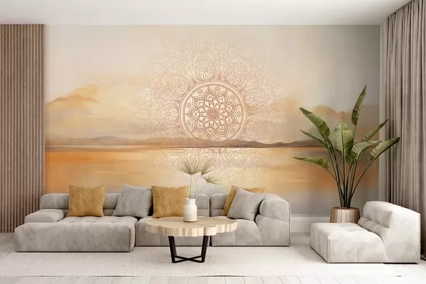 Фотошпалери Текстурований симетричний дизайн мандали, що накладається на пейзаж з морем, пагорбами та небом, м'які пастельні кольори w09491