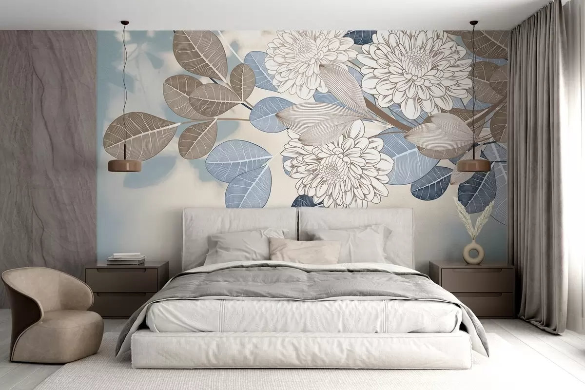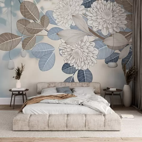 Фотошпалери Білі квіти з синіми та коричневими листям, світло-блакитний фактурний фон, квіткова композиція, детальна лінійна графіка w09496