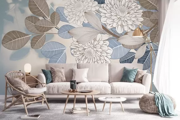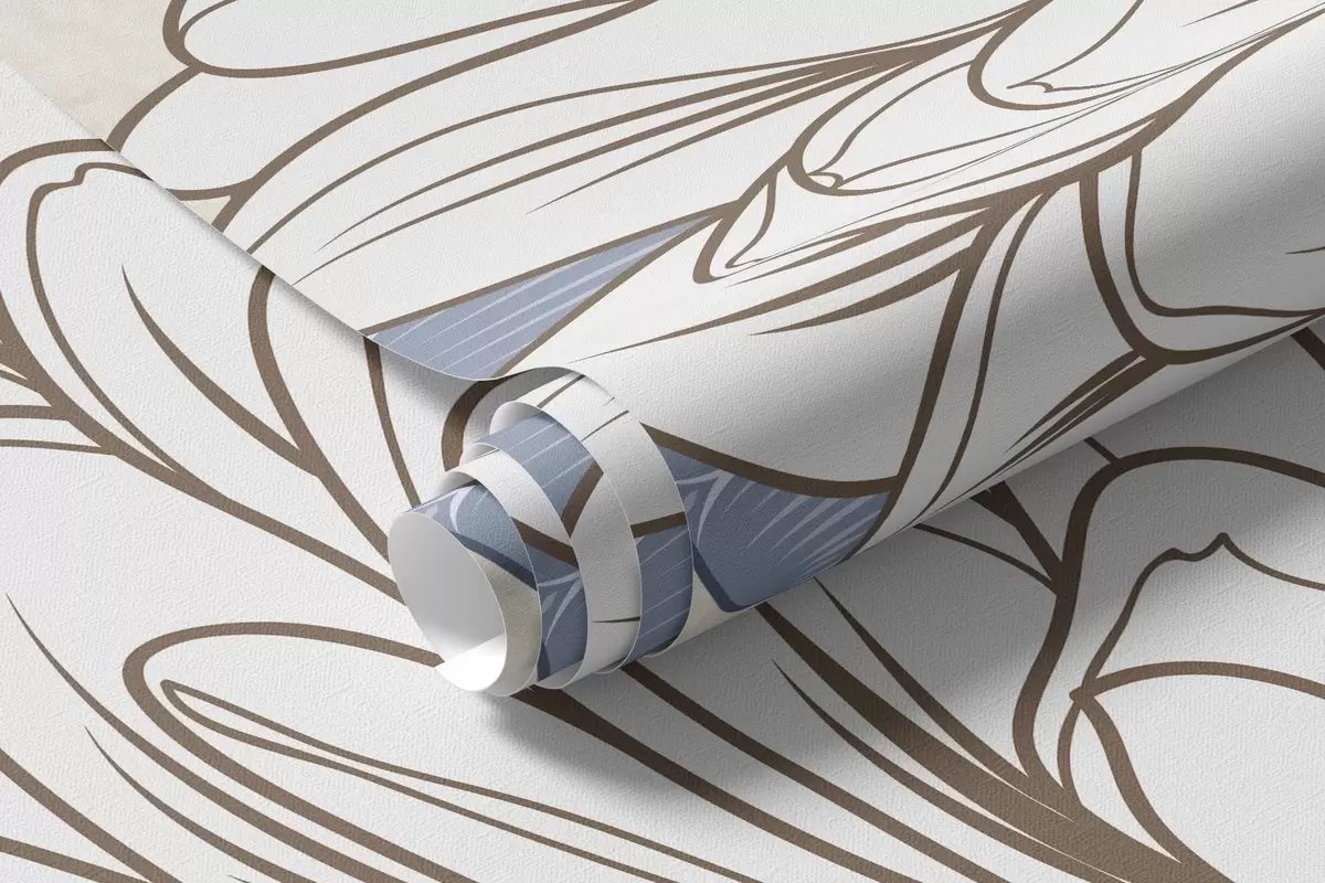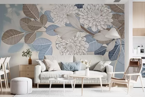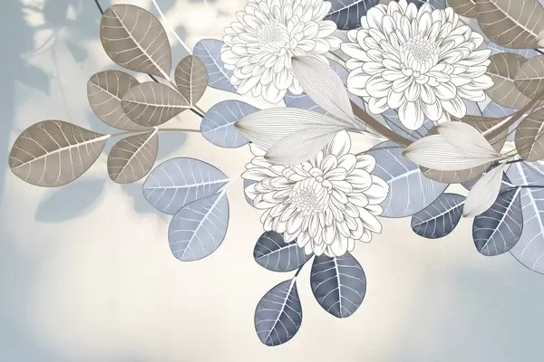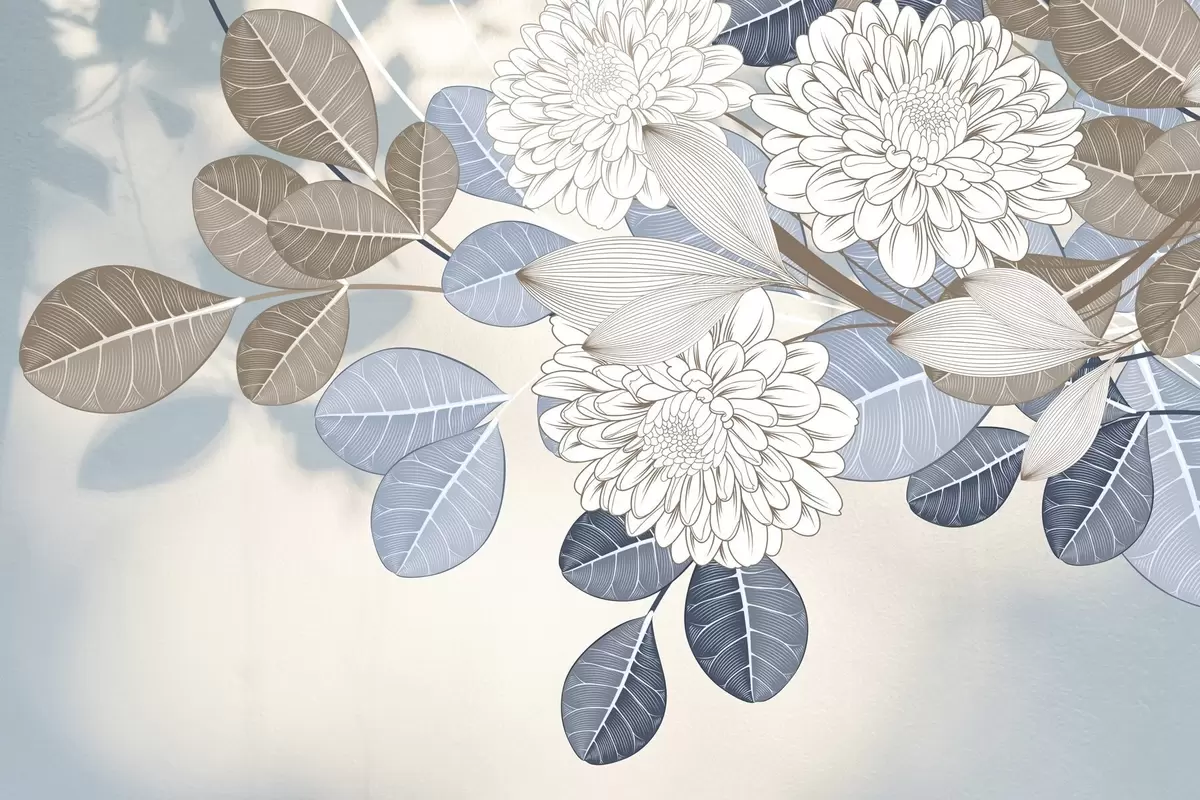 Фотошпалери Білі квіти з синіми та коричневими листям, світло-блакитний фактурний фон, квіткова композиція, детальна лінійна графіка w09496