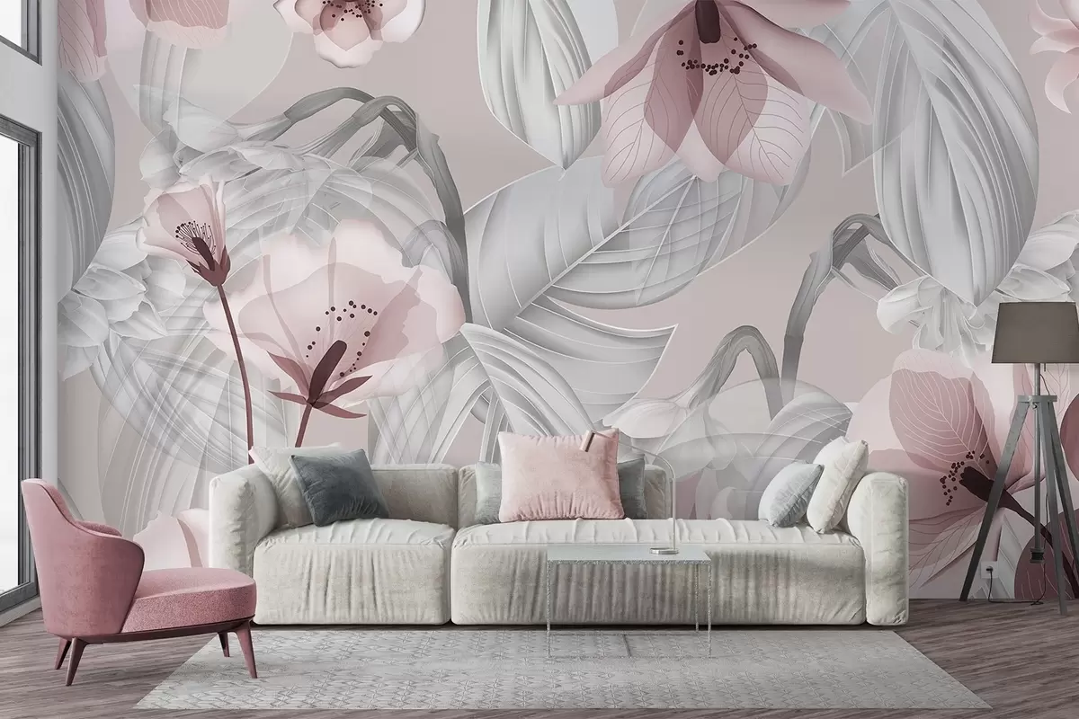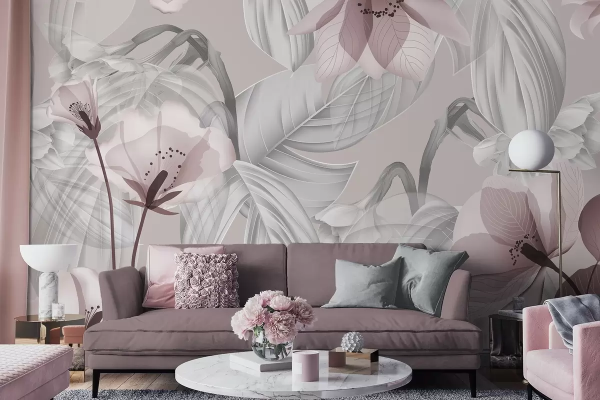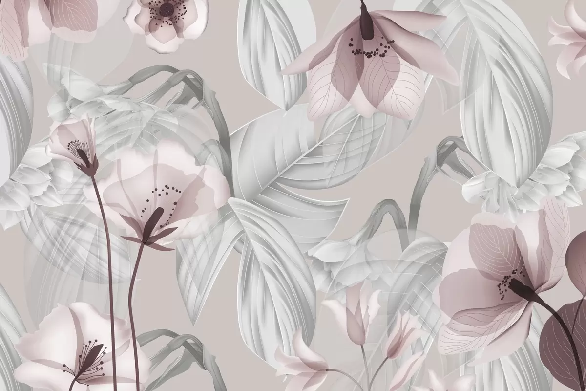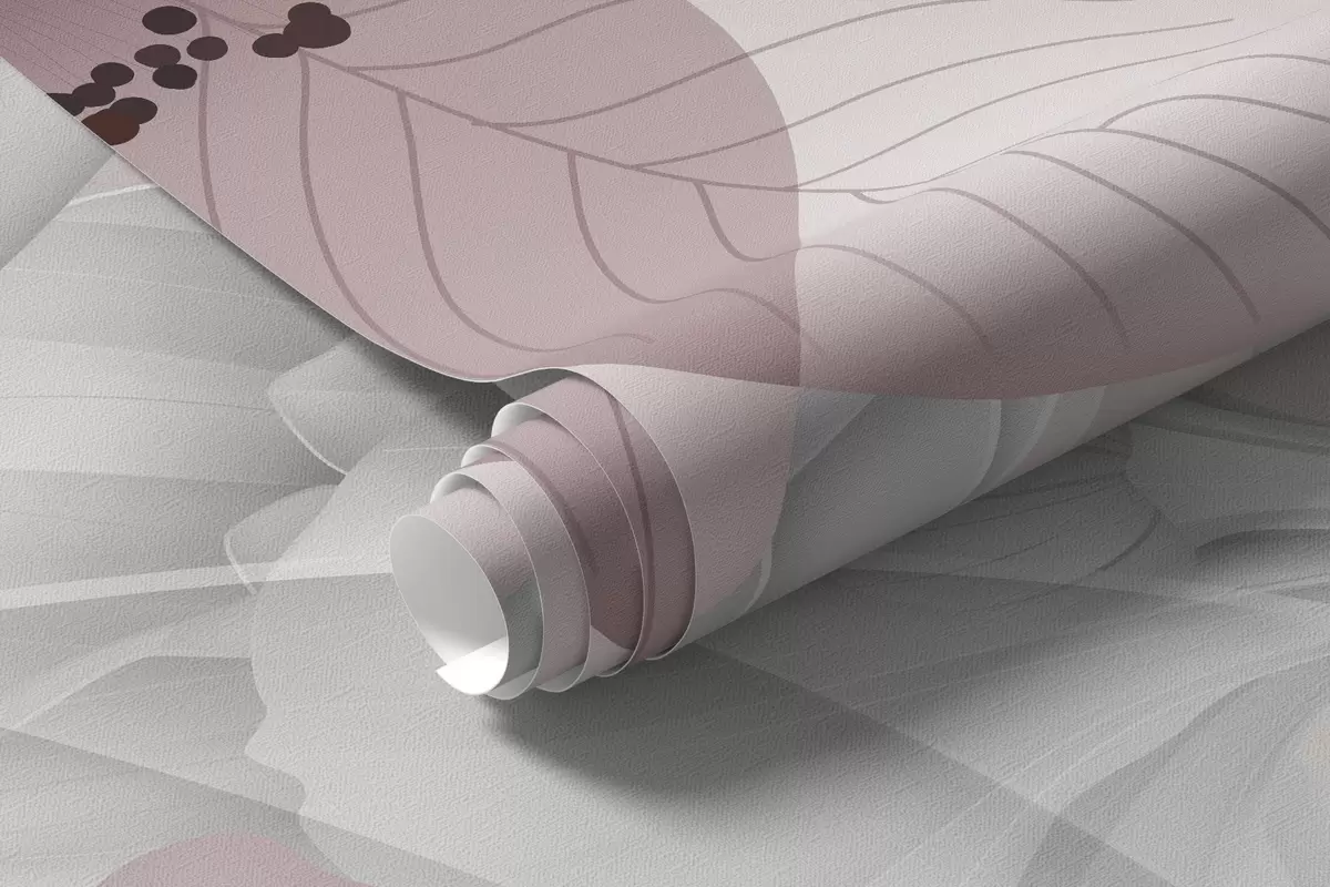 Фотошпалери Рожеві квіти та сірі листя, квітковий ботанічний фон, елегантний дизайн, м'які кольори, легкі витончені деталі w09497