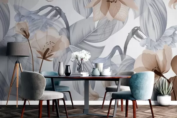Фотошпалери Коричневі квіти та сірі листя, квітковий ботанічний фон, елегантний дизайн, м'які кольори, легкі витончені деталі w09497v1