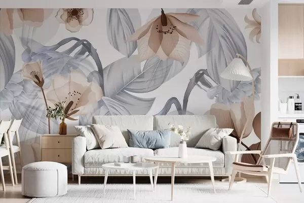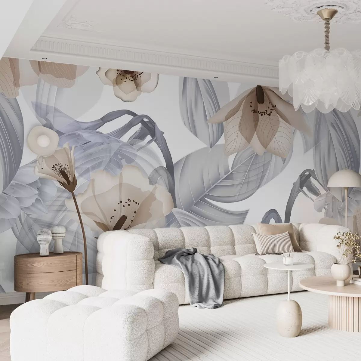 Фотошпалери Коричневі квіти та сірі листя, квітковий ботанічний фон, елегантний дизайн, м'які кольори, легкі витончені деталі w09497v1