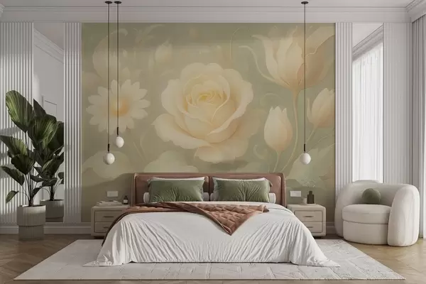 Фотошпалери Делікатна вінтажна композиція з бежевими трояндами на світло-зеленому тлі w09499