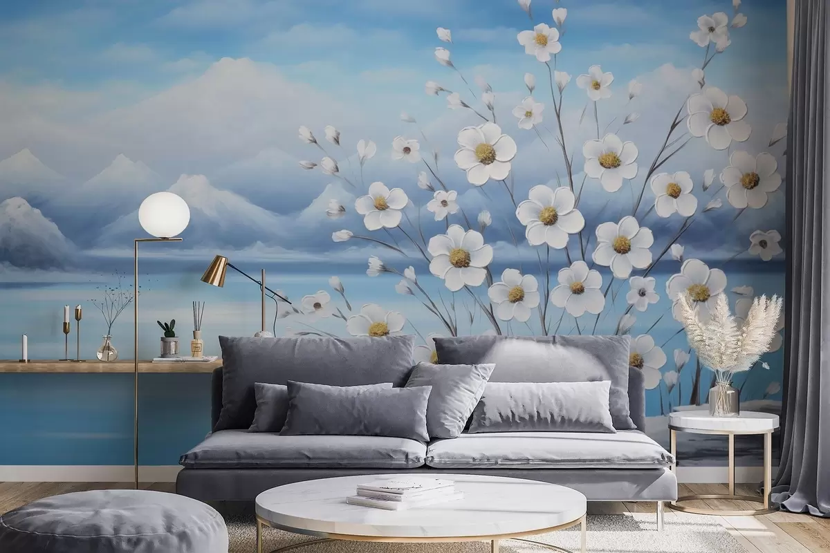 Фотошпалери Білі весняні квіти біля крижаного озера зі сніговими горами в стилі олійного живопису w09526
