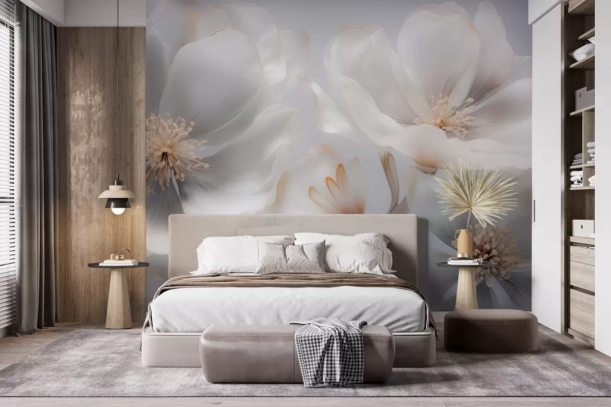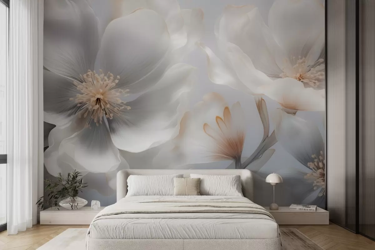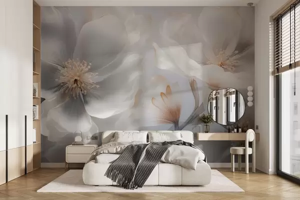Фотошпалери Перламутрові квіти в бежево-сірих і молочно-кремових відтінках w09527