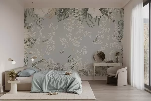 Фотошпалери Тропічна текстурована пастельна картина з птахами, метеликами, квітами гібіскуса, пальмовим листям і деревами на світло-блакитному тлі w09528