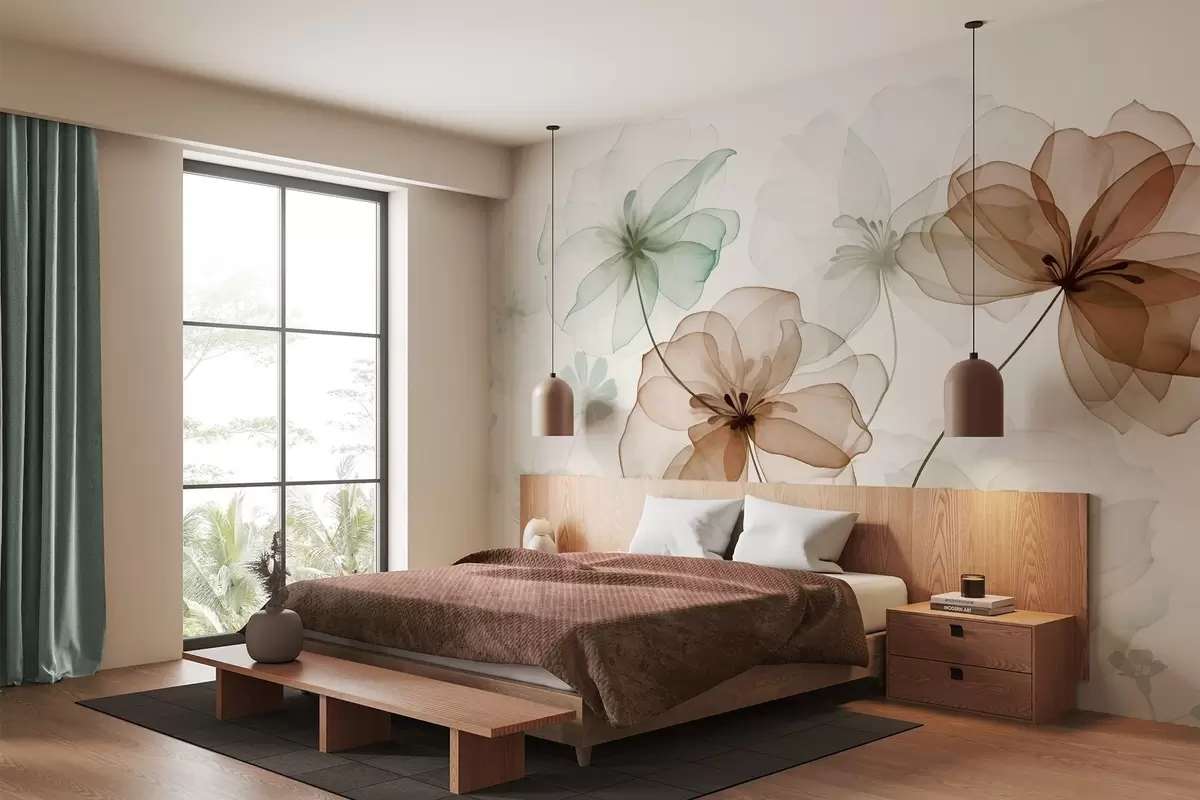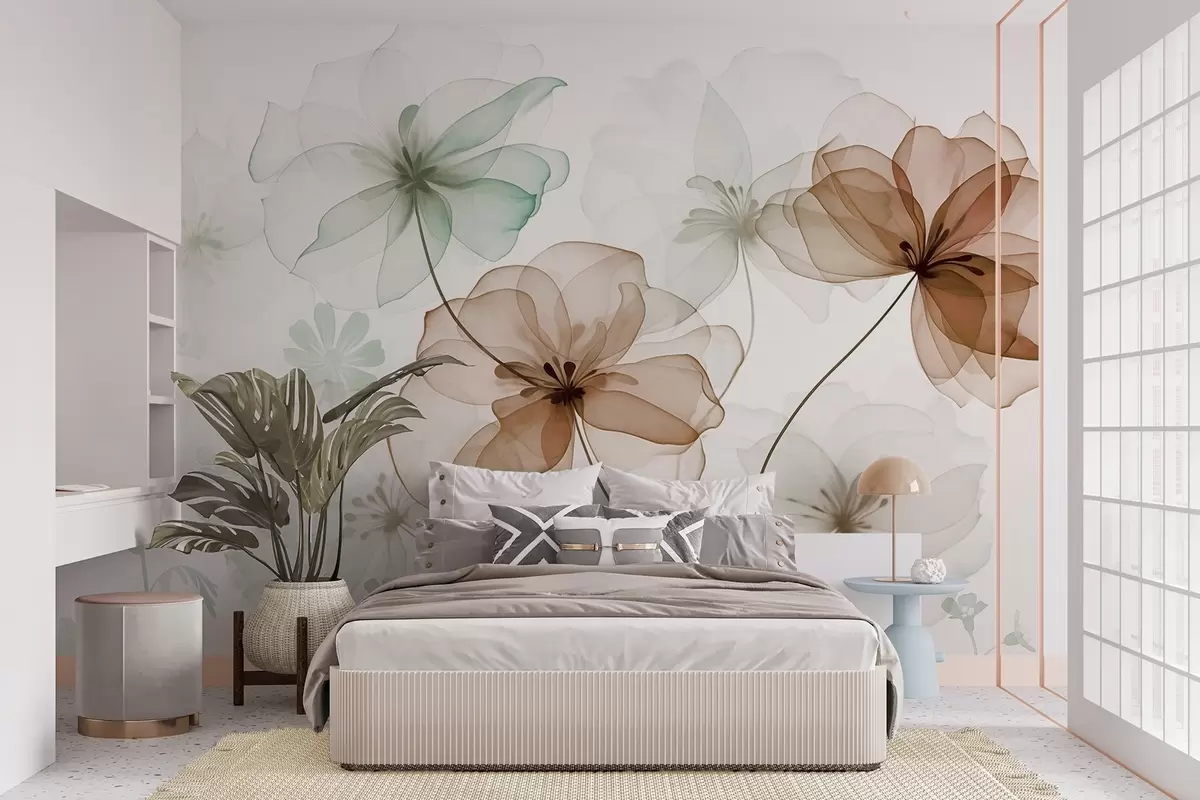 Фотошпалери Напівпрозорі квіти з коричневими та зеленими пелюстками, довгі стебла, світлий фон, ніжні кольори, текстурований квітковий дизайн w09529
