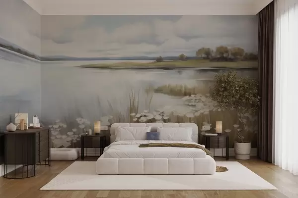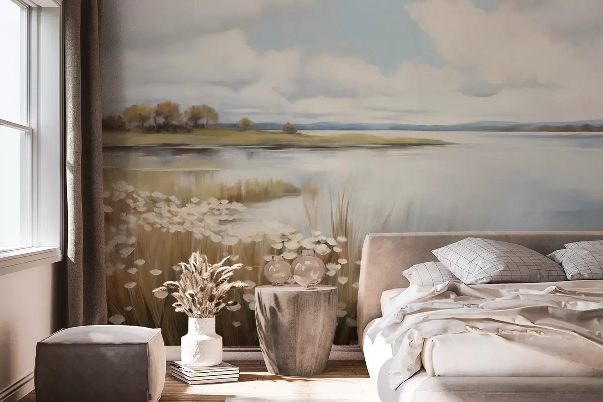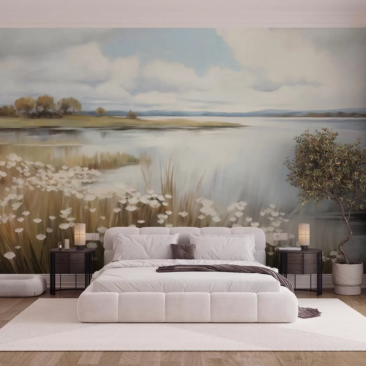Фотошпалери Текстурований пейзаж, поле білих квітів і високої трави, озеро на задньому плані, трав'янистий пагорб з деревами, м'які кольори w09530