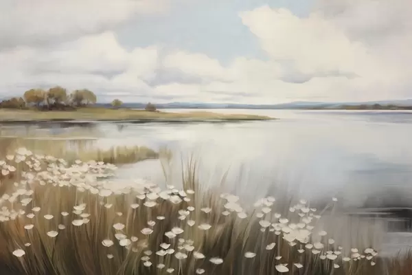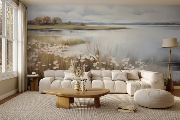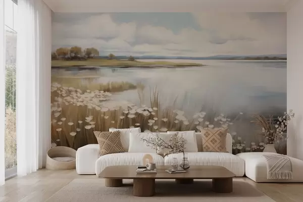 Фотошпалери Текстурований пейзаж, поле білих квітів і високої трави, озеро на задньому плані, трав'янистий пагорб з деревами, м'які кольори w09530