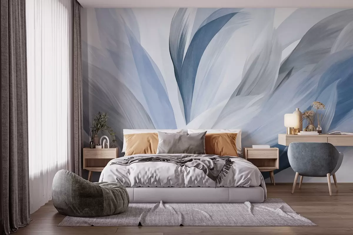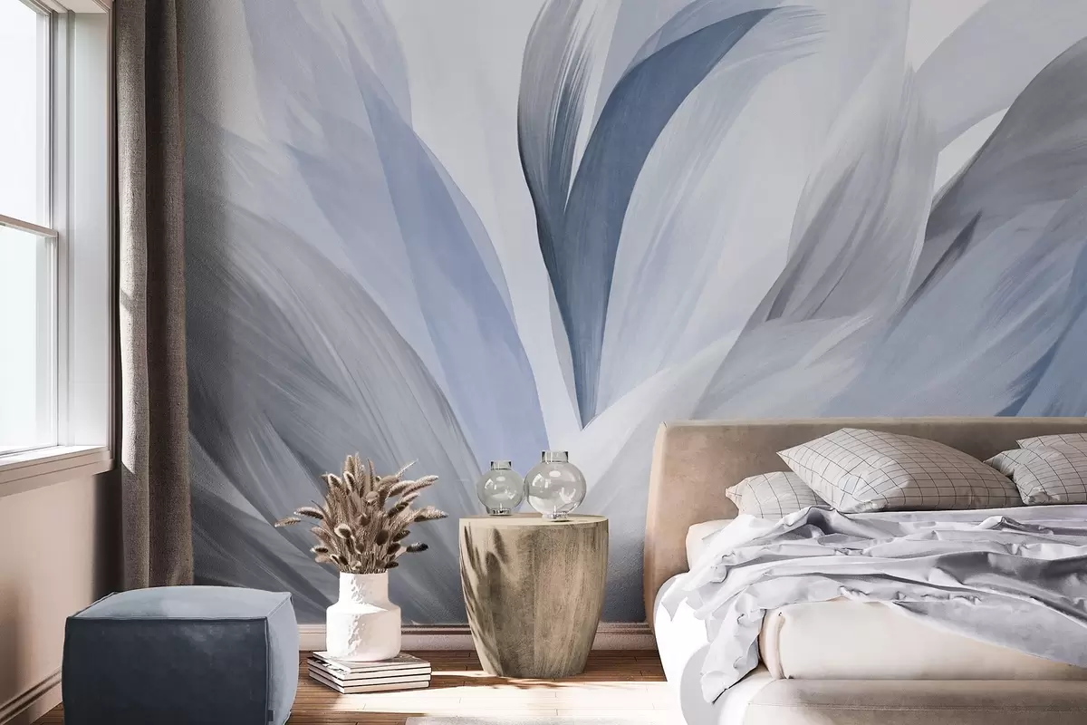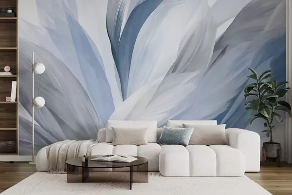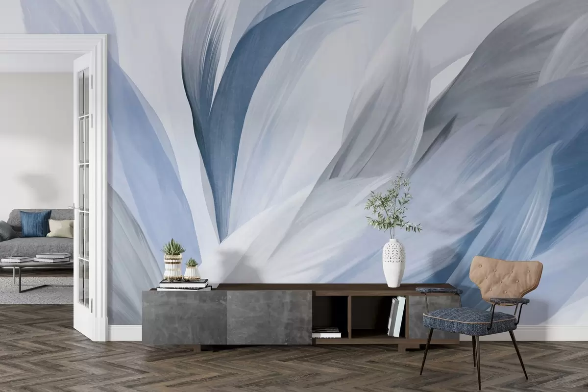Фотошпалери Абстрактні текстуровані пір'я в синьому, білому, сірому та різних відтінках, що перекриваються на білому тлі w09531v1