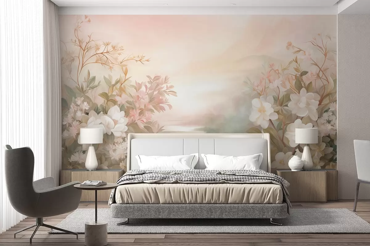 Фотошпалери Пейзаж з річкою, оточеною квітами та рослинами, м'які кольори, рожеве небо, акварельний текстурований стиль w09537