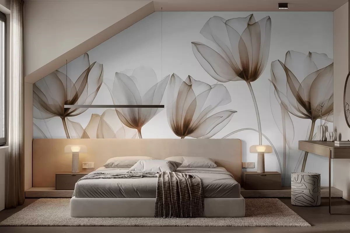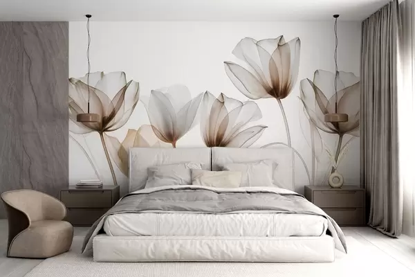 Фотошпалери Напівпрозорі коричневі та білі квіти тюльпанів з довгими стеблами на світлому тлі, ніжне та фактурне квіткове мистецтво w09538v1