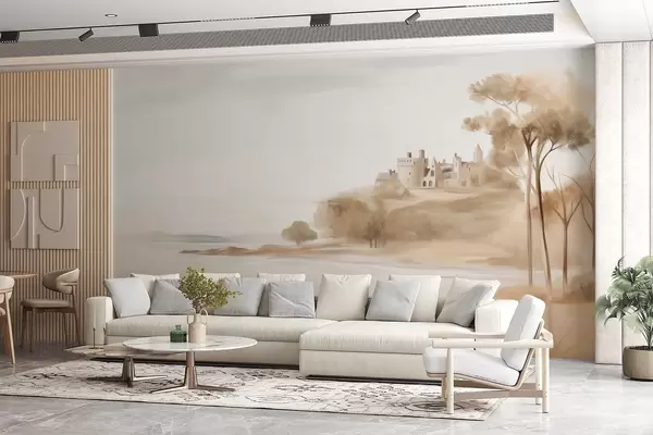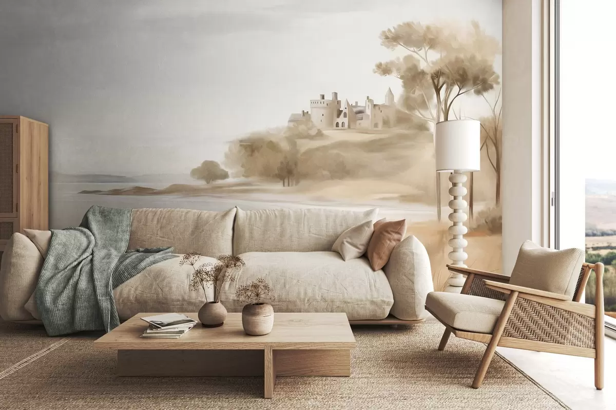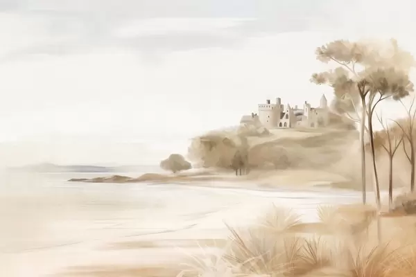 Фотошпалери Пейзаж із замком на пагорбі біля моря, піщаний пляж на передньому плані, приглушені кольори, фактурне мистецтво w09540
