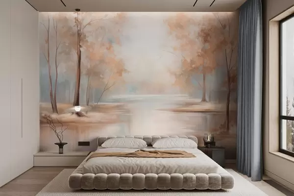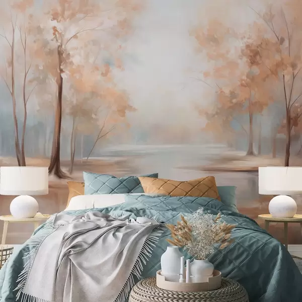 Фотошпалери Осінній текстурований пейзаж з деревами та річкою, м'які кольори, легка та повітряна атмосфера, спокійна та тиха сцена w09541