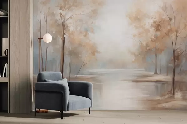 Фотошпалери Осінній текстурований пейзаж з деревами та річкою, м'які кольори, легка та повітряна атмосфера, спокійна та тиха сцена w09541