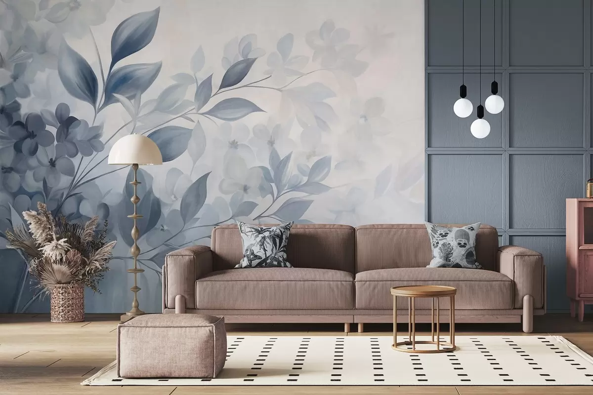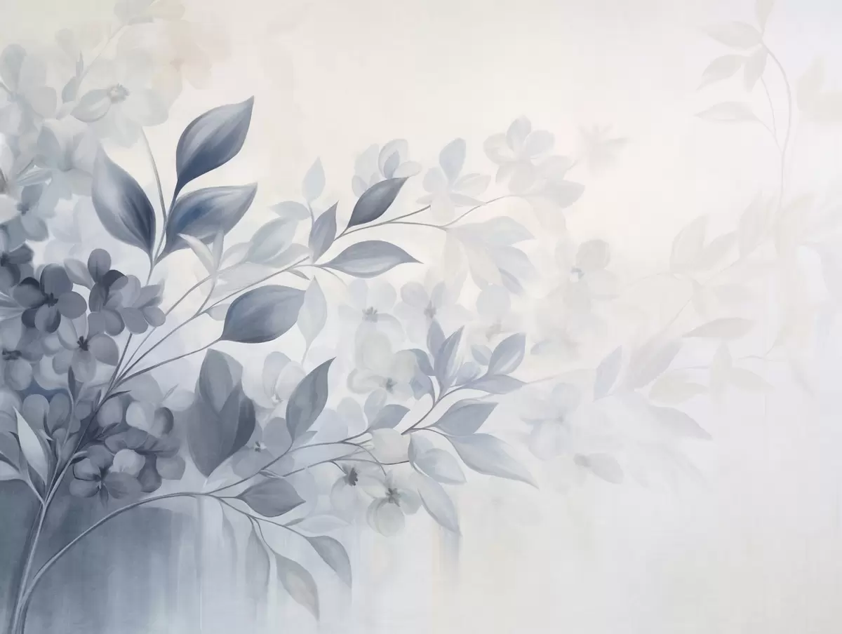Фотошпалери Текстурована синьо-біла гілка з квітами та листям, що зникають на світлому тлі в стилі акварельного живопису w09543