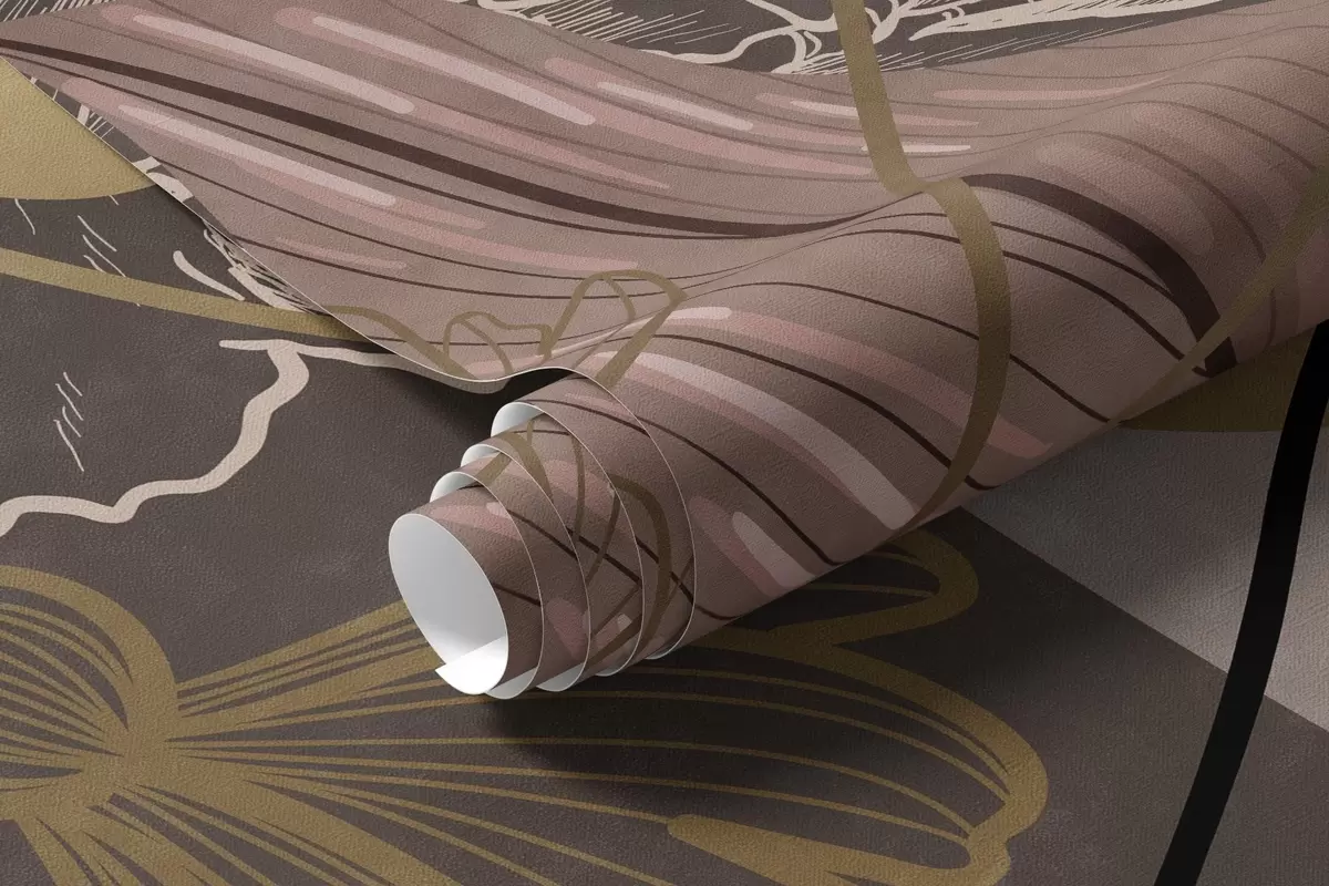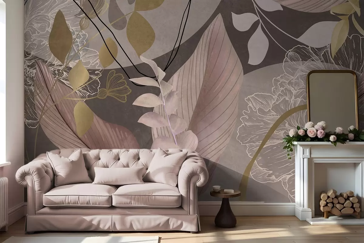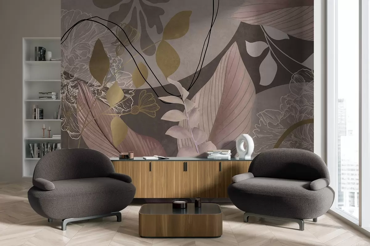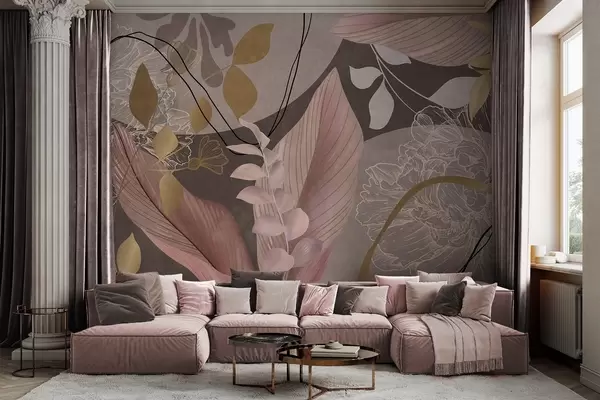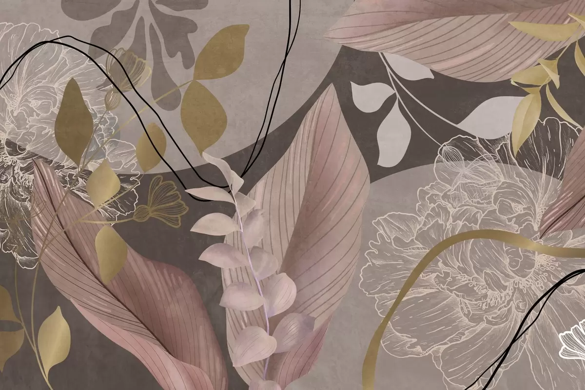 Фотошпалери Абстрактний квітковий принт з великими листям у відтінках приглушеного рожевого та коричневого кольорів з тонкими чорними лініями та білими квітковими контурами. w09544