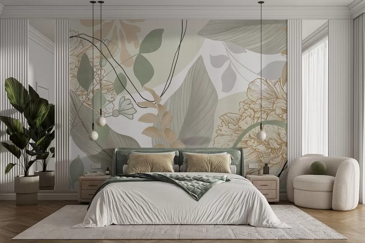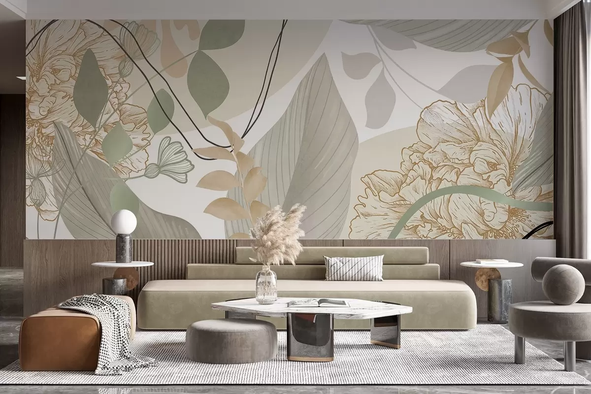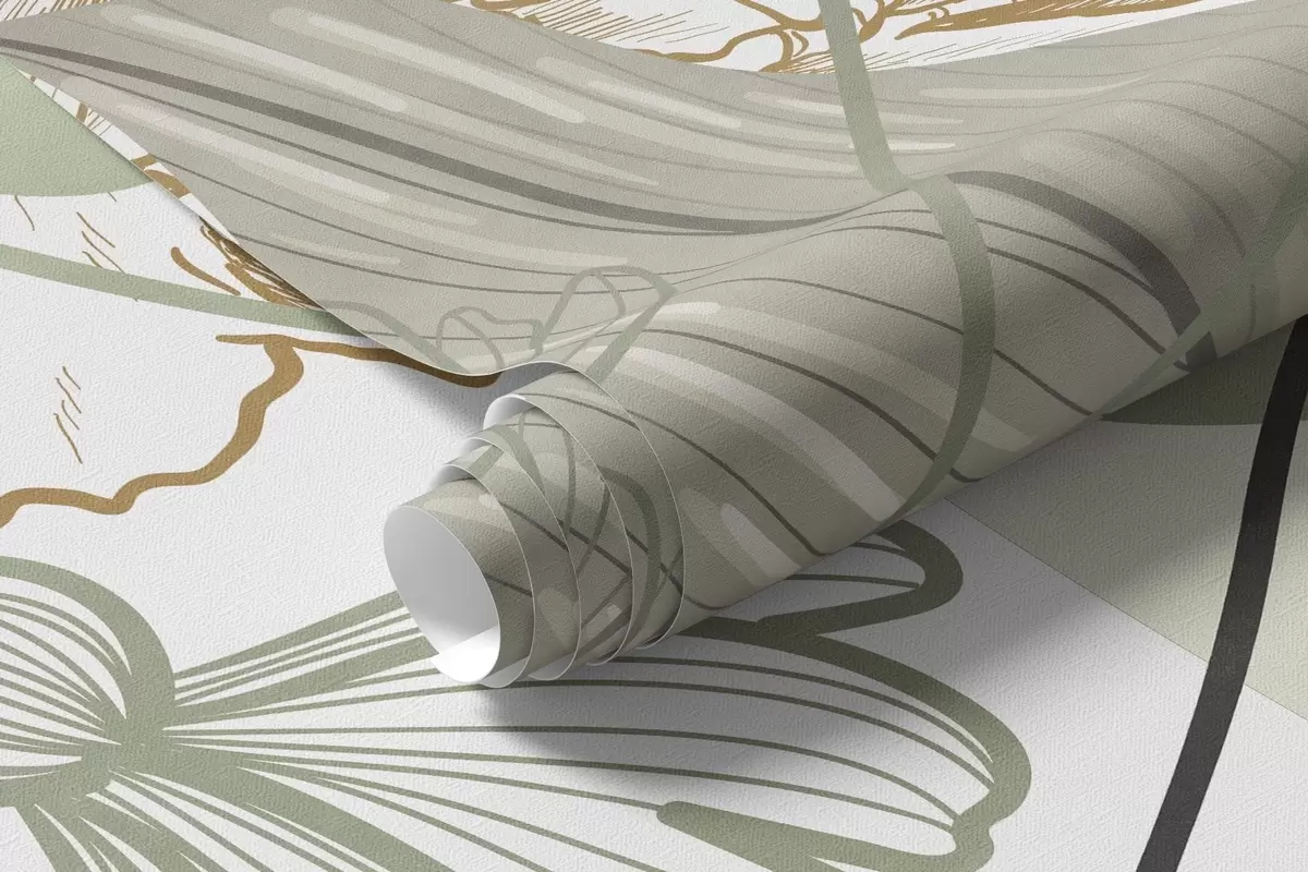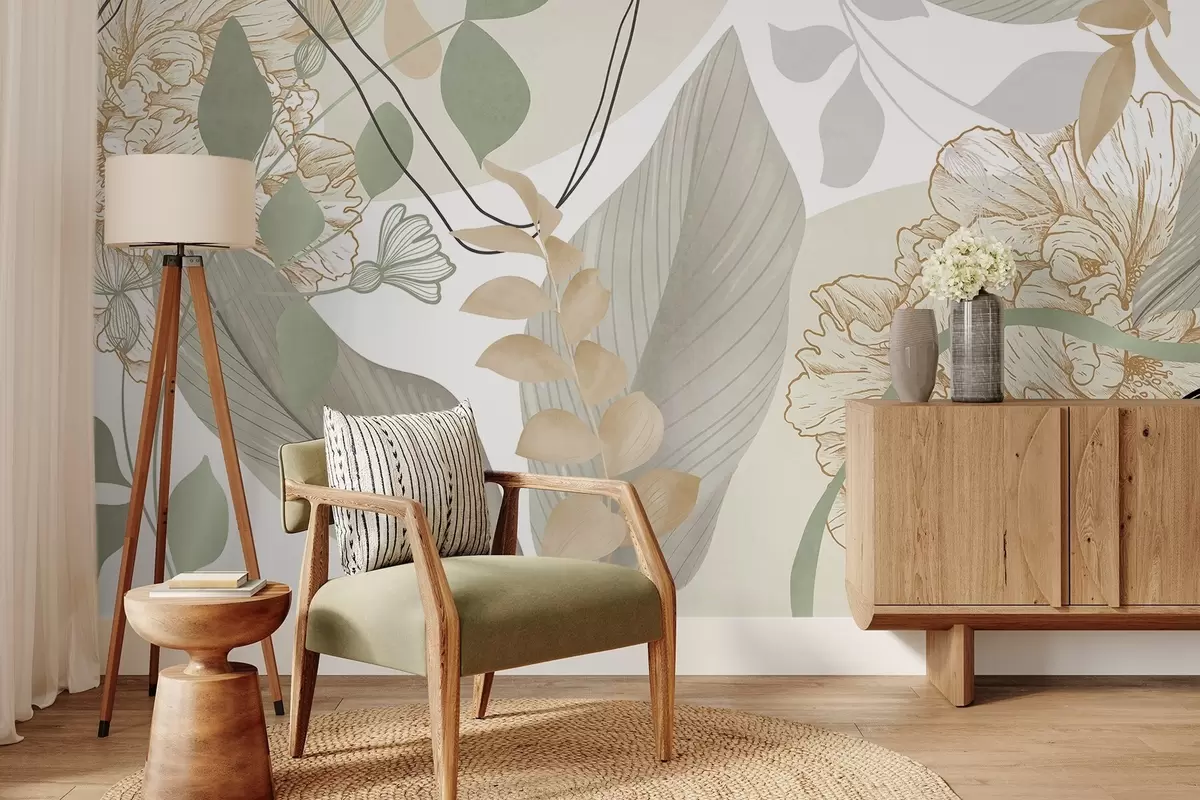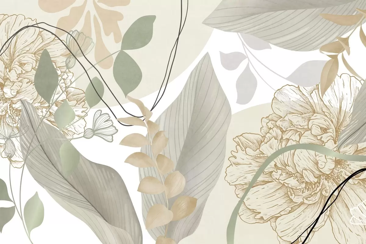 Фотошпалери Абстрактний квітковий принт з великими листям у відтінках приглушеного зеленого та жовтого кольорів з тонкими чорними лініями та білими квітковими контурами w09544v2