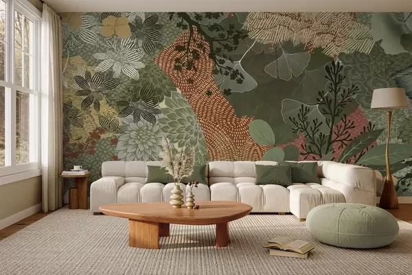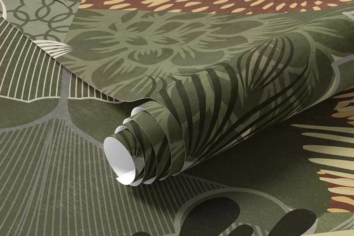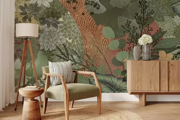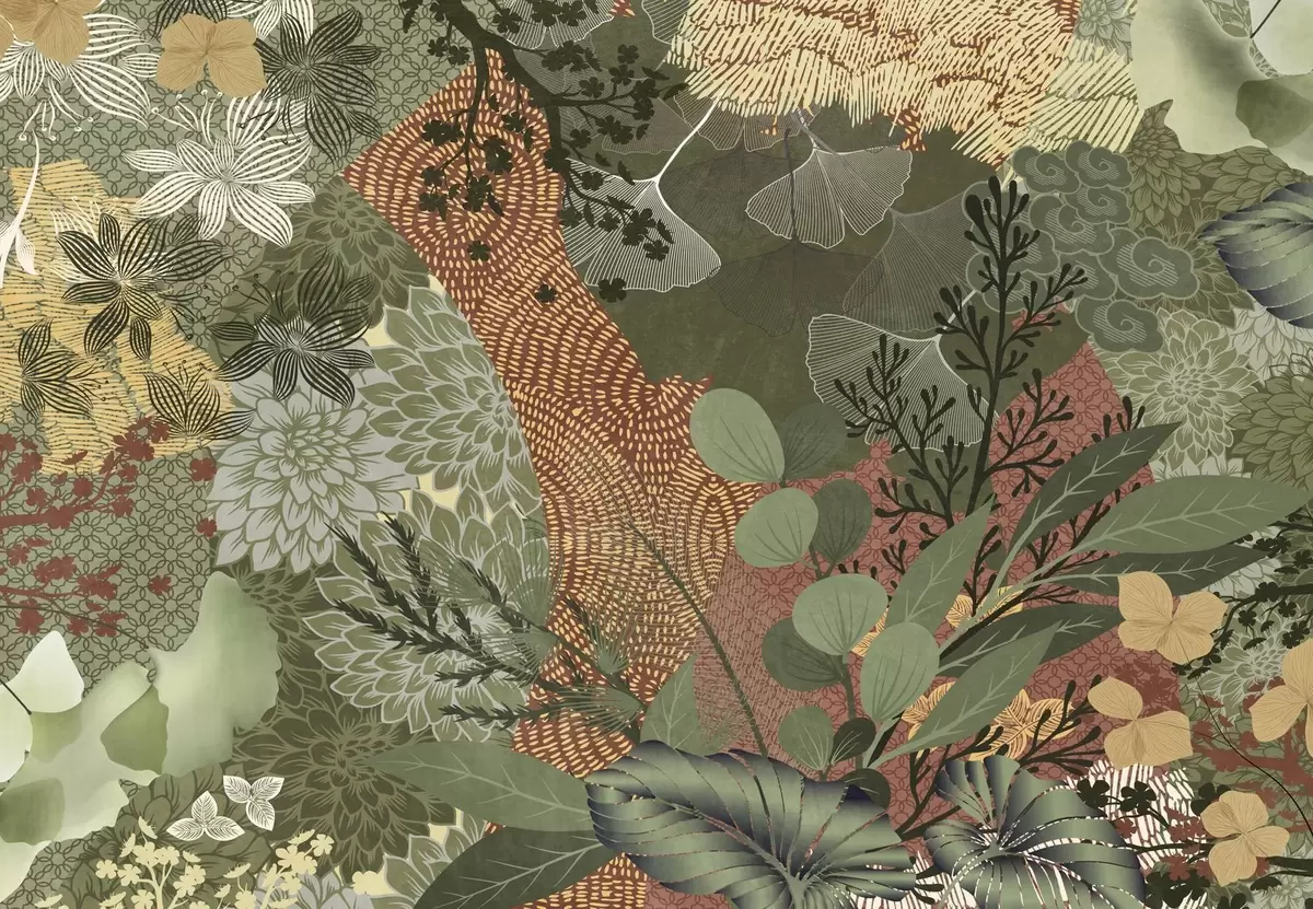 Фотошпалери Абстрактний текстурований колаж з ботанічних елементів з листям, квітами та органічними текстурами в відтінках зеленого та коричневого кольорів. w09545