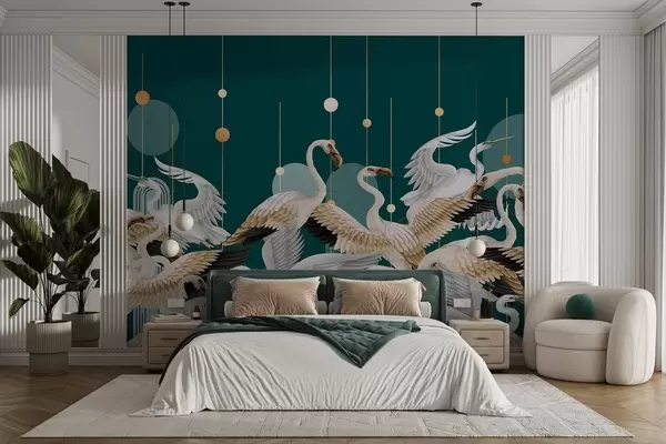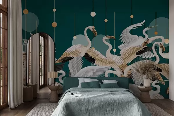 Фотошпалери Зграя білих фламінго з ніжними крилами на темно-синьому тлі з жовтими лініями та колами w09546