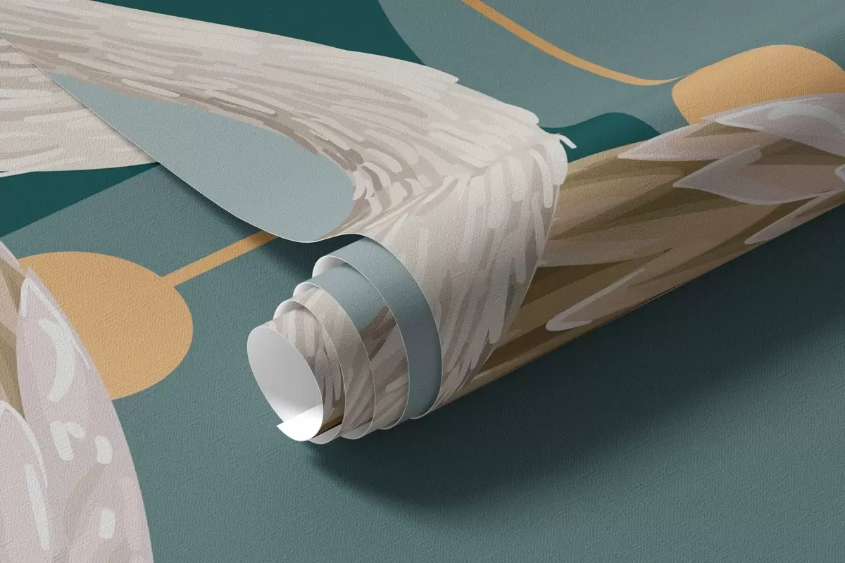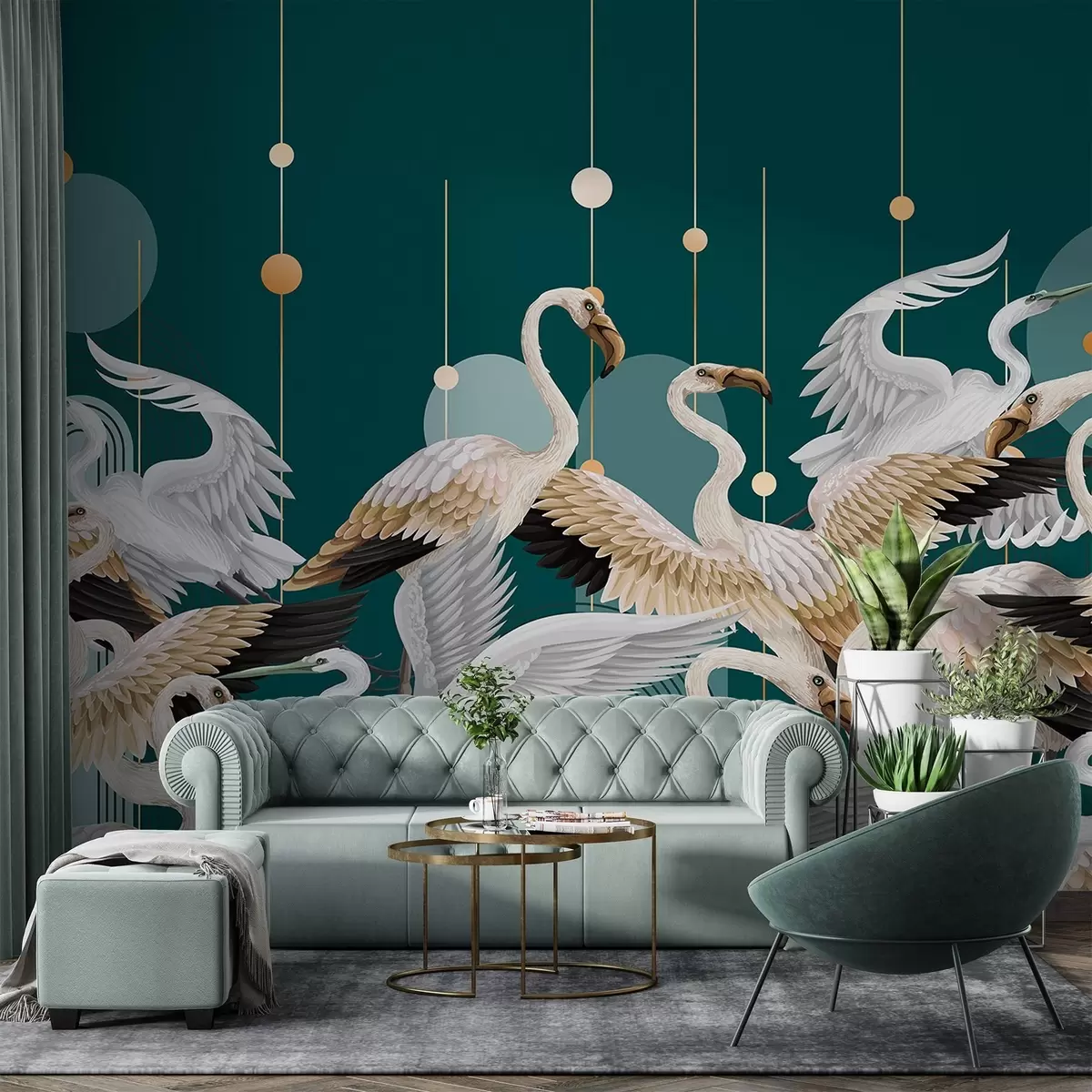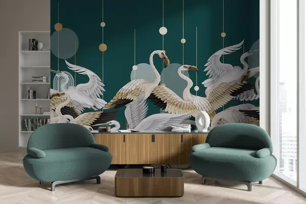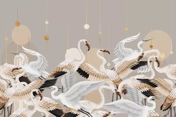 Фотошпалери Зграя білих фламінго з ніжними крилами на темно-синьому тлі з жовтими лініями та колами w09546
