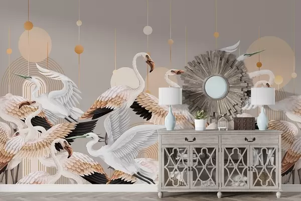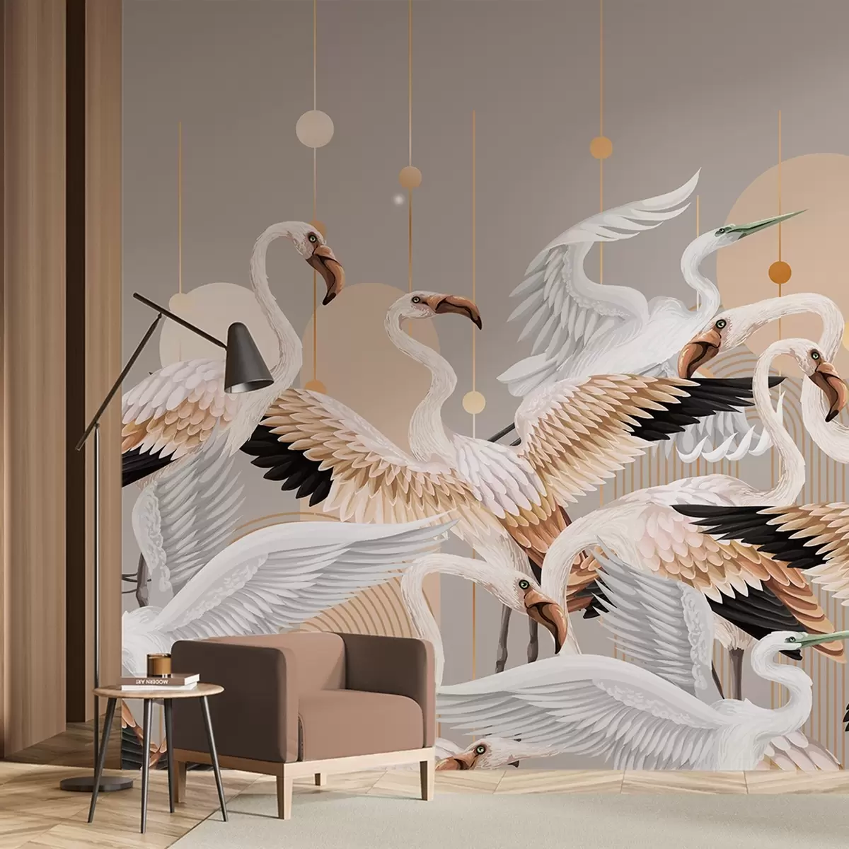 Фотошпалери Зграя білих фламінго з ніжними крилами на нейтральному тлі з жовтими лініями та колами w09546v1