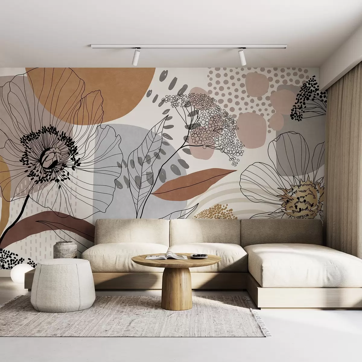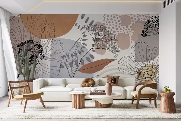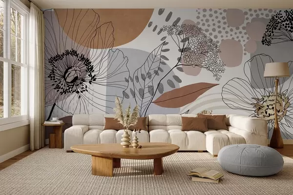 Фотошпалери Абстрактний квітковий принт з лінійними малюнками квітів, листя та органічних форм у приглушених коричневих, бежевих та сірих тонах. w09548