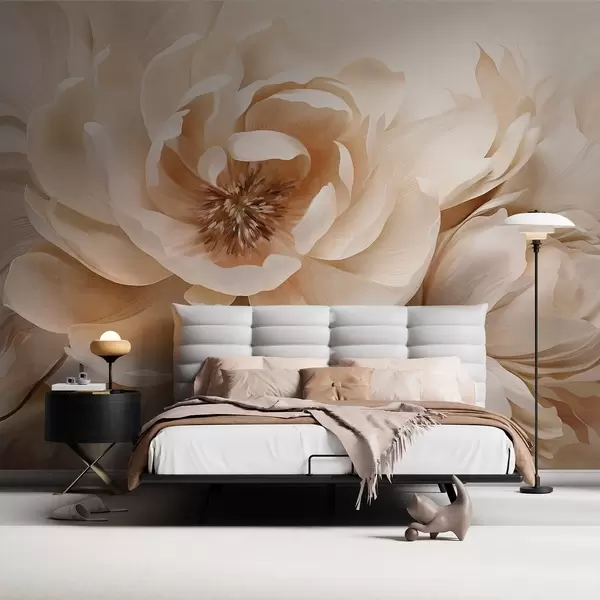 Фотошпалери Кремові півонії з коричневими серединками та листям на розмитому світлому абстрактному тлі w09554