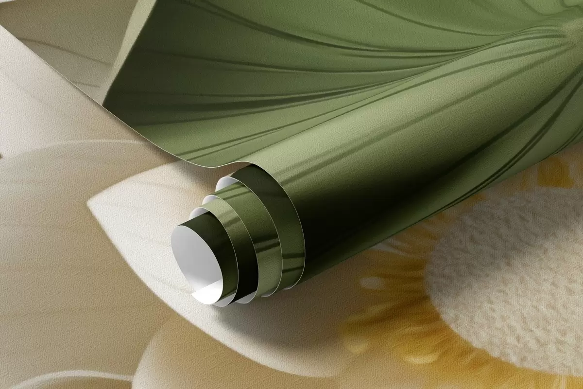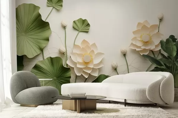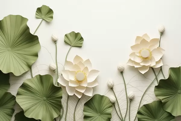 Фотошпалери 3D-квіти лотоса із зеленими текстурованими листям, мінімалістичний стиль w09560