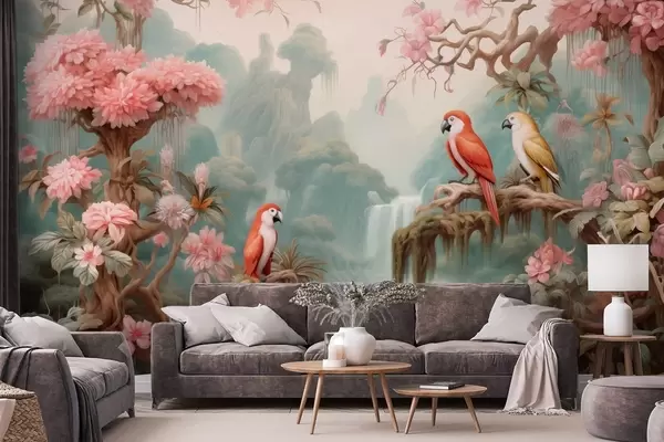 Фотошпалери Казковий тропічний ліс з папугами, квітучими деревами з рожевими квітами та водоспадом w09580