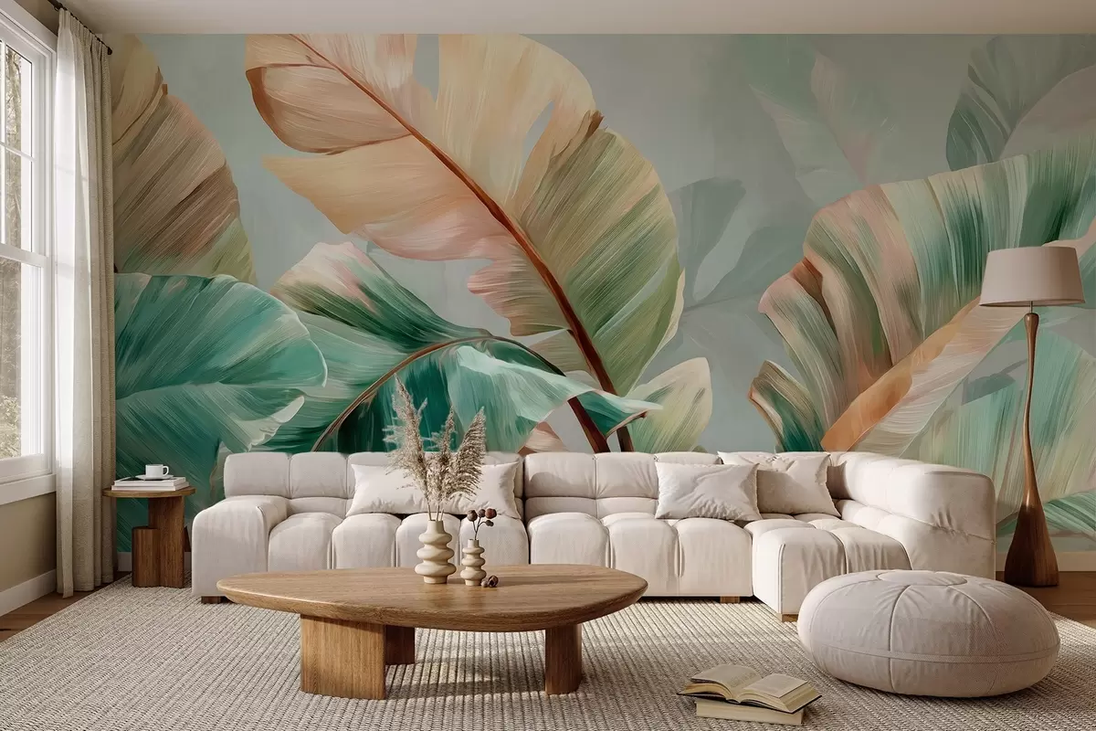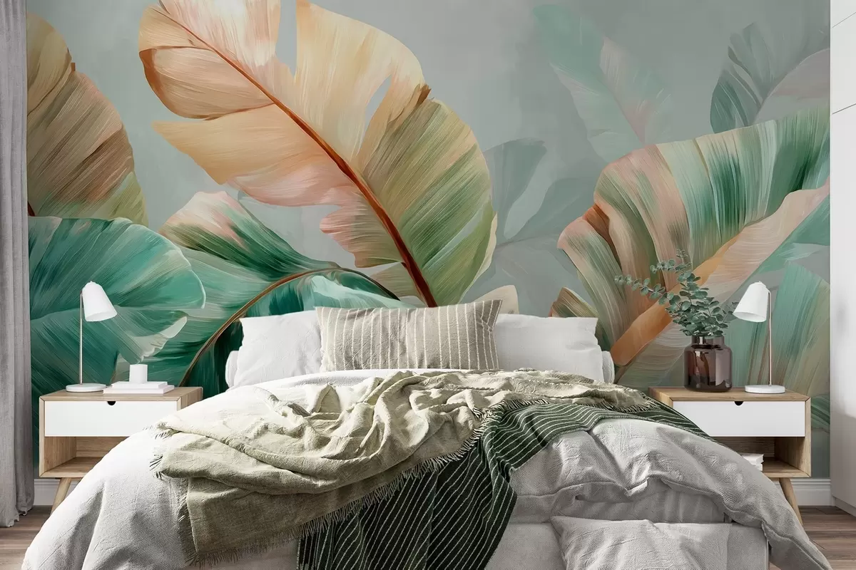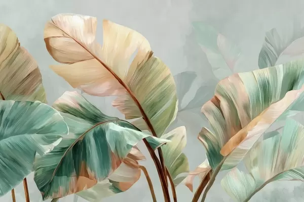 Фотошпалери Ніжні тропічні бананові листя в пастельних жовто-зелених тонах w09581