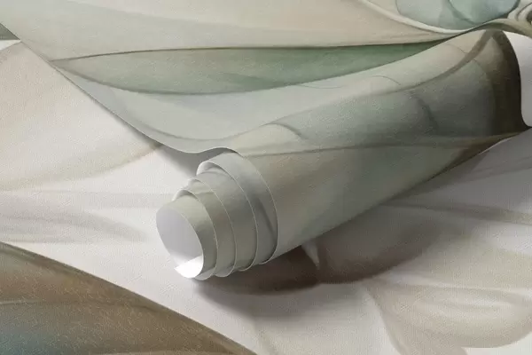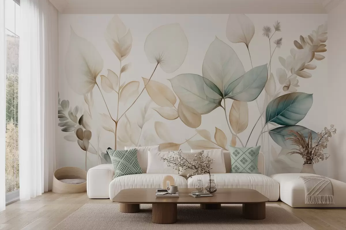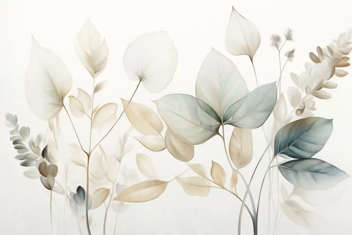 Фотошпалери Текстуровані напівпрозорі листя в приглушених бежевих і бірюзових тонах, з ніжними стеблами на м'якому, світлому тлі w09583