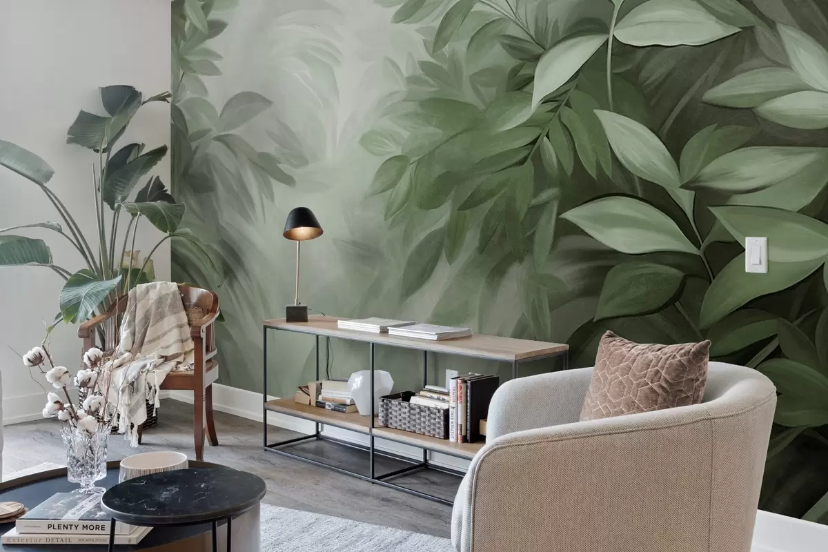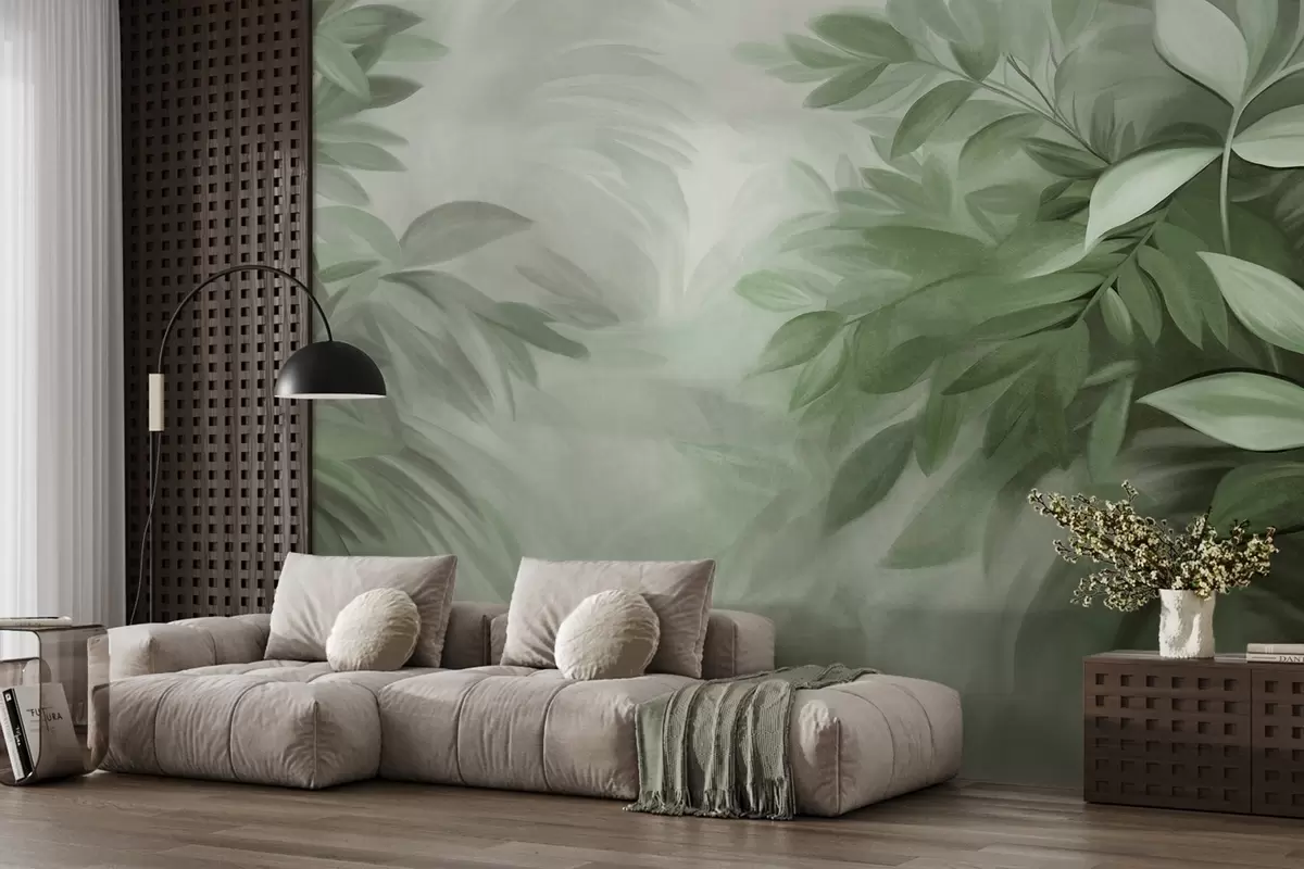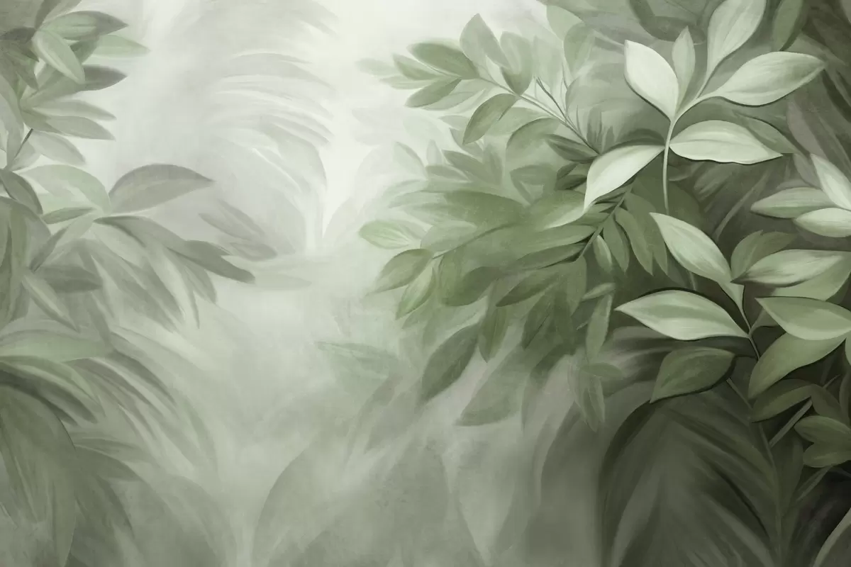 Фотошпалери Зелене та сіре листя з м'якою, розмитою текстурою, у живописному стилі з видимими мазками пензля. w09584v1