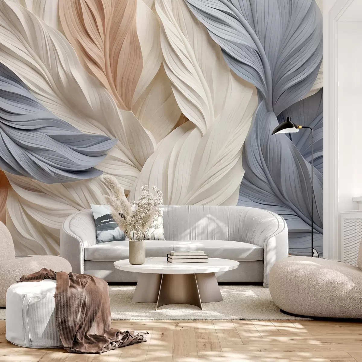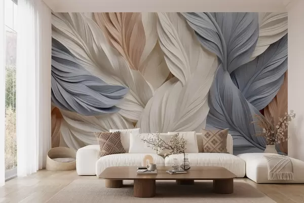 Фотошпалери Абстрактні, багатошарові пір'я кремового, бежевого та світло-блакитного відтінків, з текстурованим, органічним виглядом. w09603