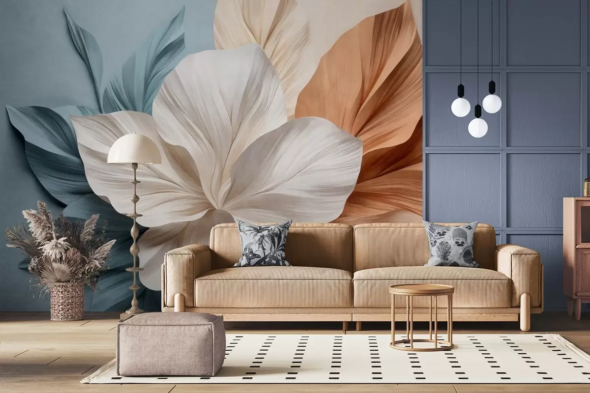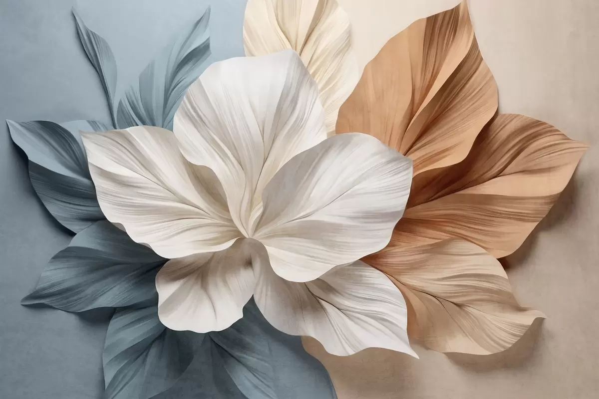 Фотошпалери Абстрактна квітка з багатопелюстковими квітками та текстурованими листям у відтінках персикового та блакитного кольорів, м'який фон w09604