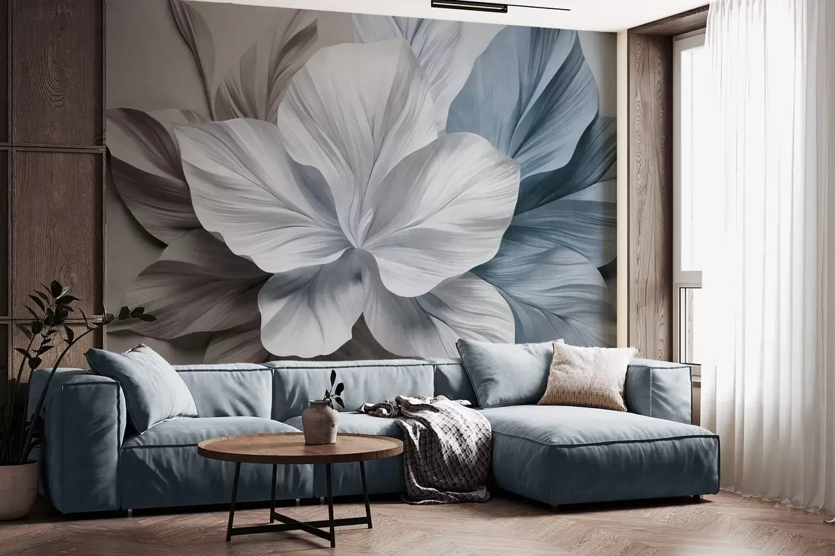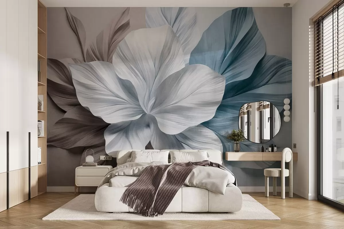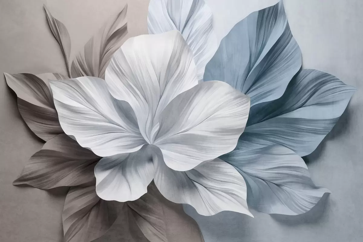 Фотошпалери Абстрактна квітка з багатопелюстковими квітками та текстурованими листям у відтінках коричневого та синього кольорів, м'який фон w09604v1