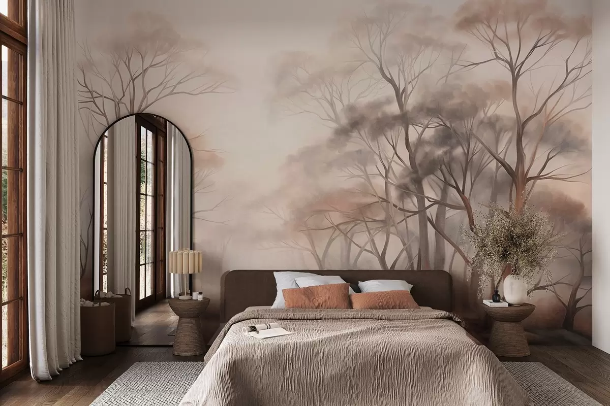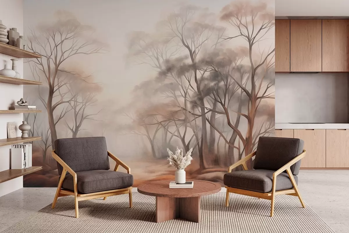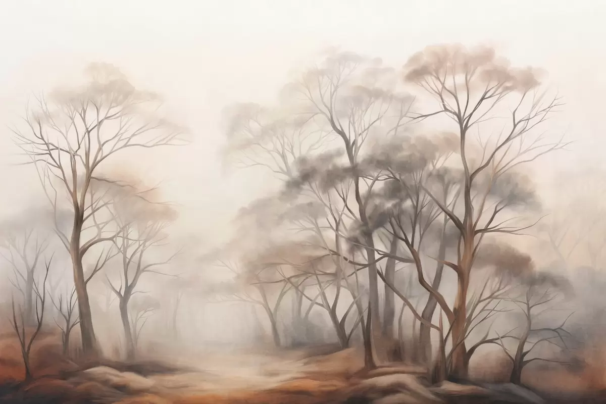Фотошпалери Текстуровані дерева в туманному лісі, туманний пейзаж з приглушеними кольорами та м'яким освітленням w09609