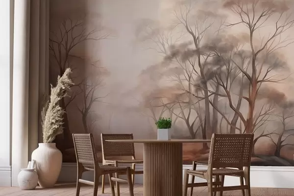 Фотошпалери Текстуровані дерева в туманному лісі, туманний пейзаж з приглушеними кольорами та м'яким освітленням w09609