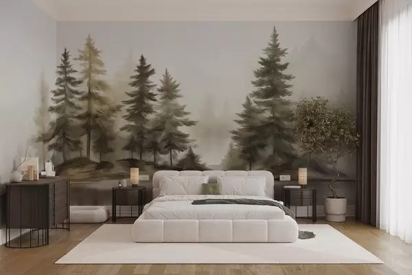Фотошпалери Текстурований туманний ліс з високими соснами, імітація живопису w09610