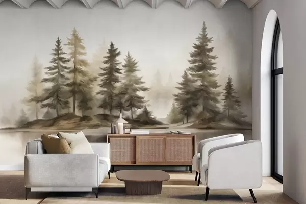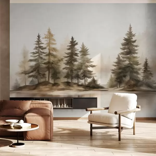 Фотошпалери Текстурований туманний ліс з високими соснами, імітація живопису w09610