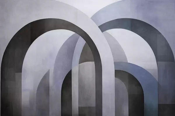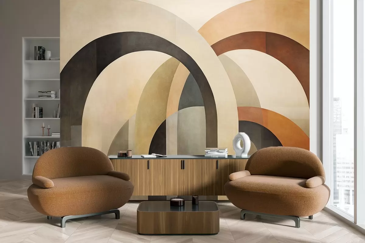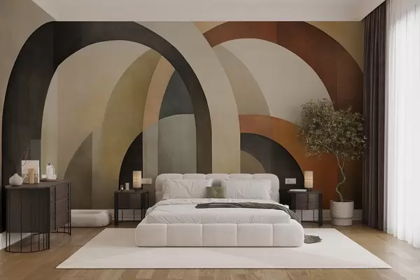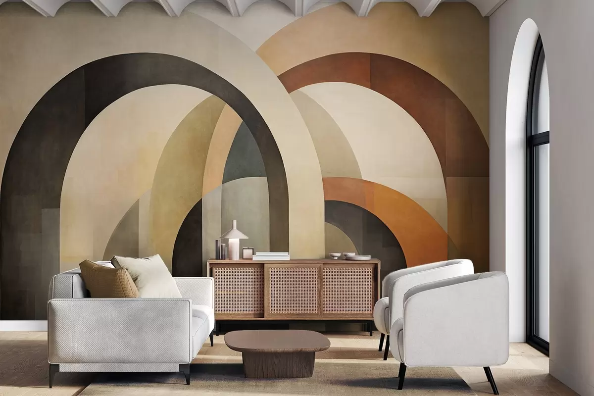 Фотошпалери Абстрактні текстуровані геометричні арки в землистих відтінках бежевого, коричневого та сірого кольорів, багатошаровий сучасний архітектурний дизайн w09611