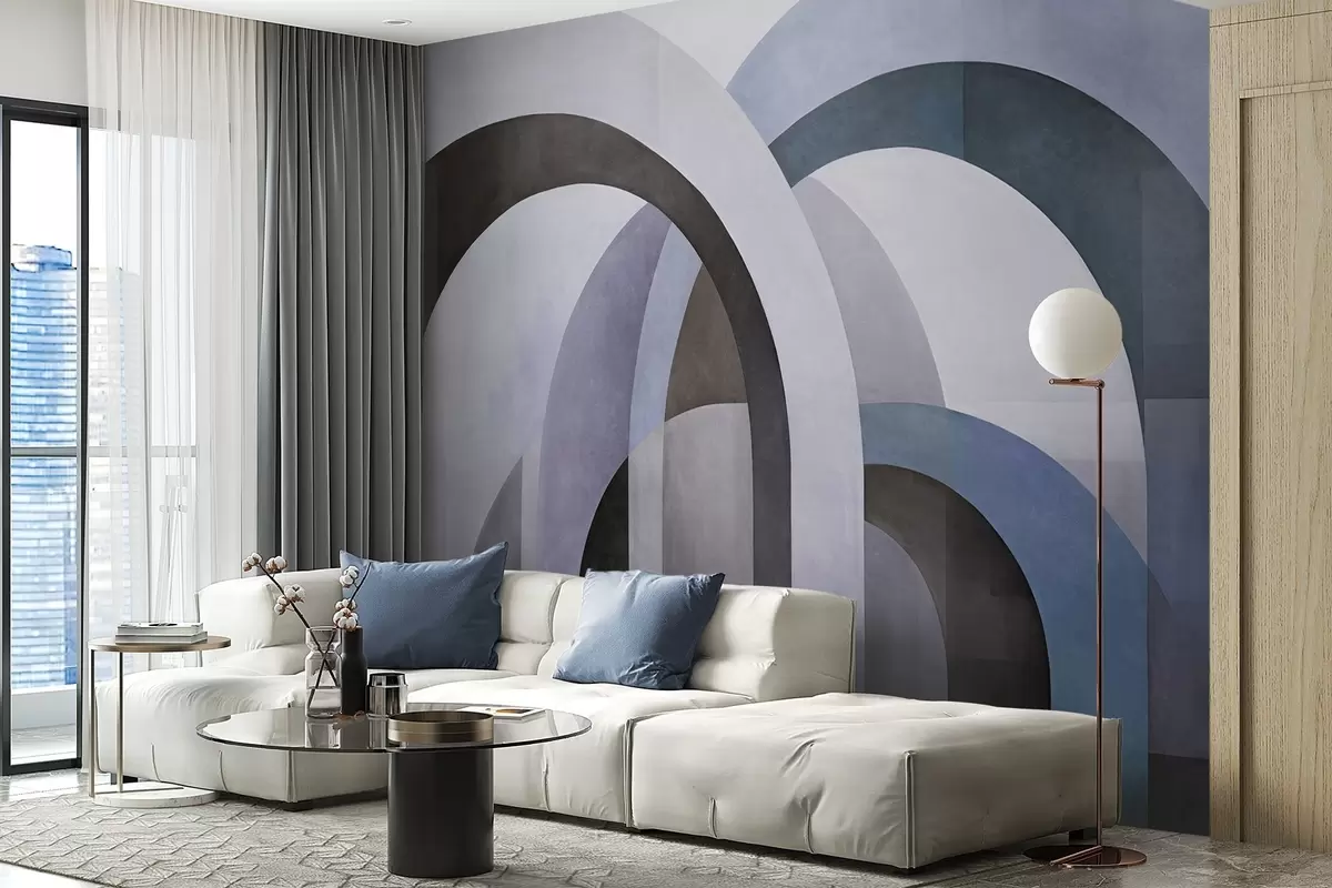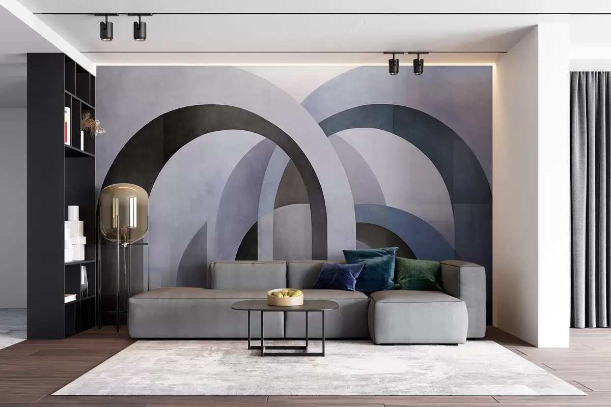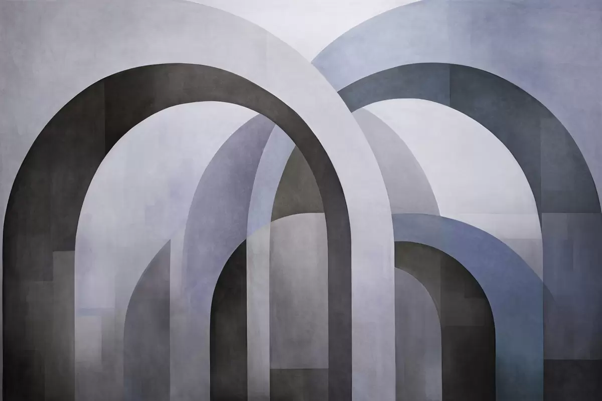 Фотошпалери Абстрактні текстуровані геометричні арки в синіх, чорних і сірих тонах, багатошаровий сучасний архітектурний дизайн w09611v1