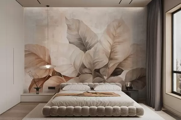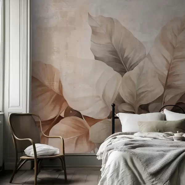Фотошпалери Текстуроване малювання імітації великих світло-коричневих листя на нейтральному тлі з тонким мазком пензля w09614