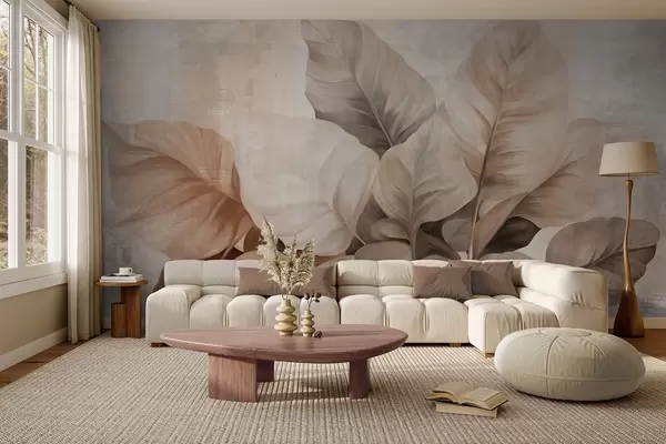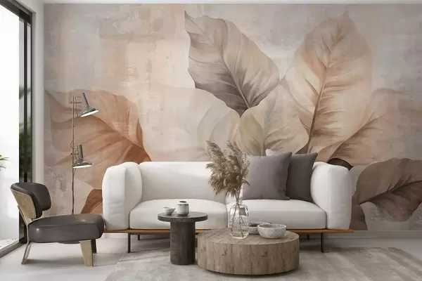 Фотошпалери Текстуроване малювання імітації великих світло-коричневих листя на нейтральному тлі з тонким мазком пензля w09614