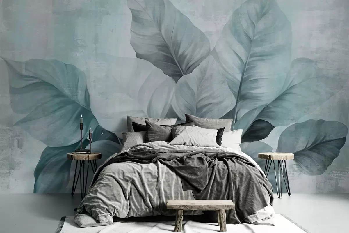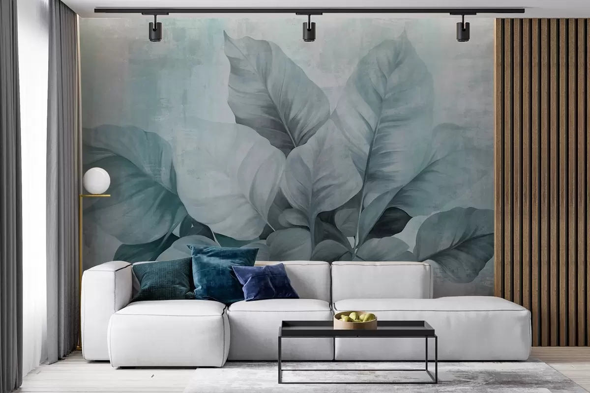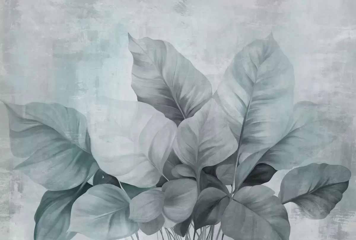 Фотошпалери Текстуроване зображення великих світло-блакитних листя на нейтральному тлі з тонким мазком пензля w09614v2